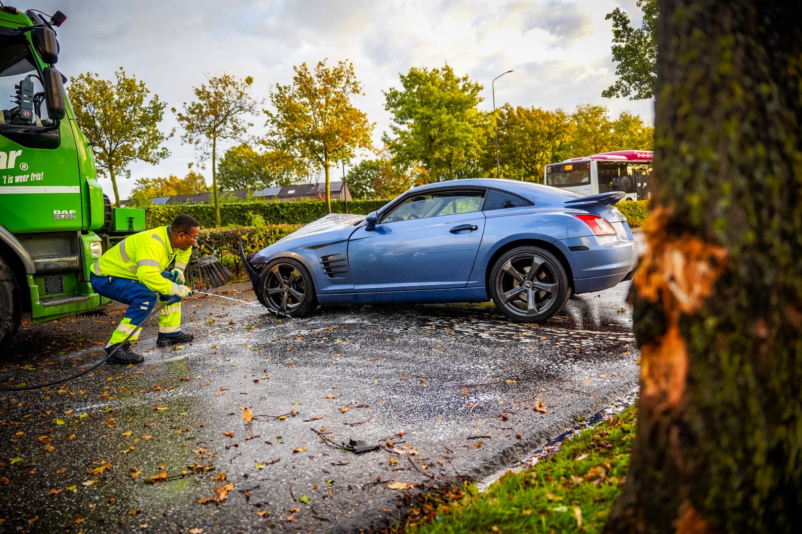 NIJMEGEN – Donderdagochtend rond 08.12 uur heeft een auto een boom geraakt op de Wijchenseweg ter hoogte van de Tonronde, nabij de kruising met de Viaductweg. De bestuurder gaf aan dat hij rustig de weg op reed, maar begon te slippen door olie op het wegdek. Door de achterwielaandrijving kon hij het voertuig niet meer corrigeren.