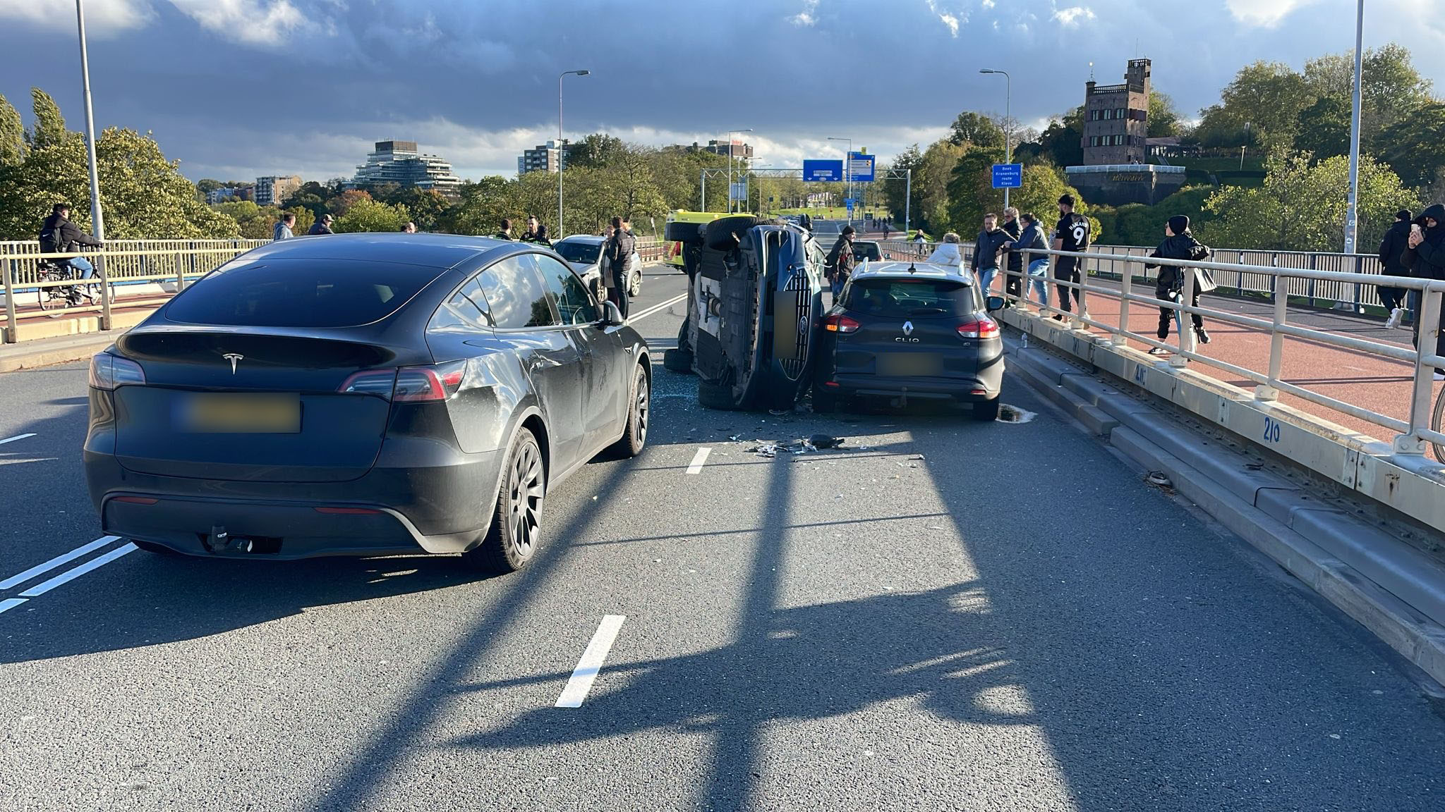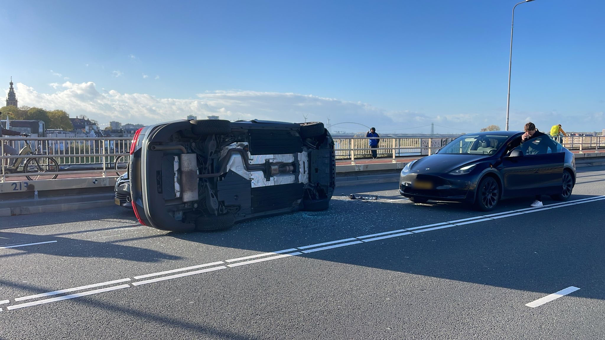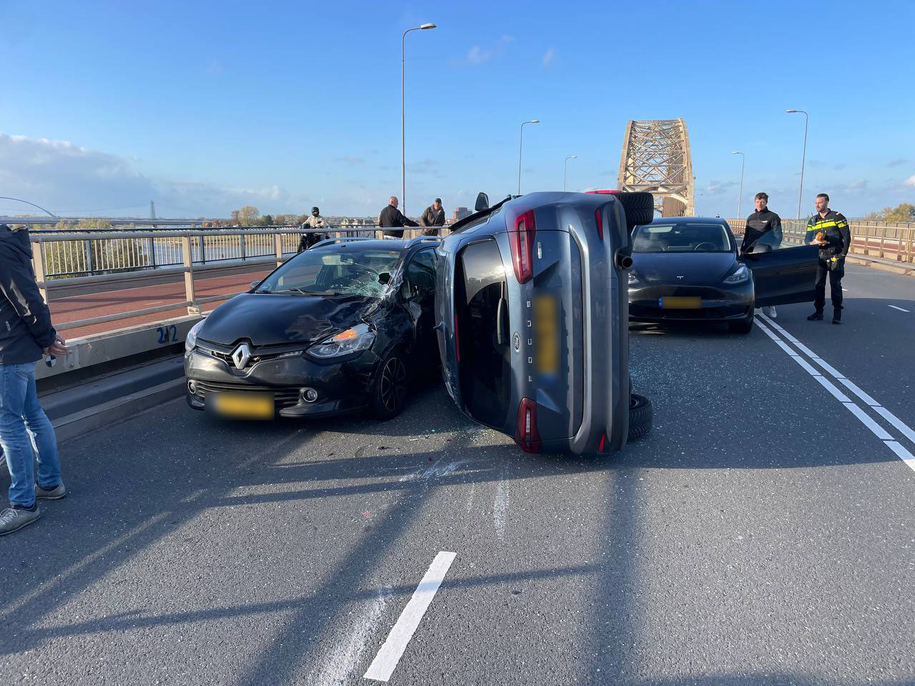 NIJMEGEN – Aan het eind van vrijdagmiddag heeft er op de Waalbrug een verkeersongeval plaatsgevonden waarbij meerdere auto’s betrokken waren. Eén van de voertuigen is daarbij op zijn zijkant terechtgekomen.