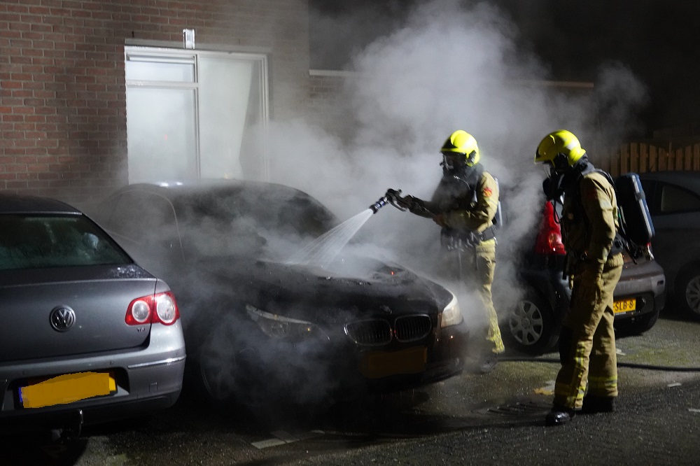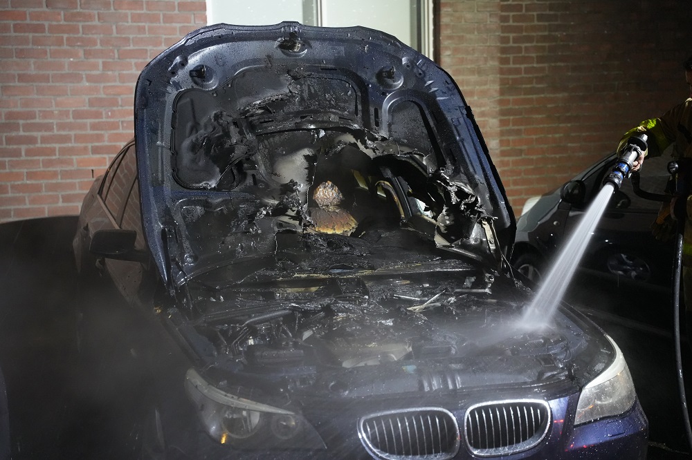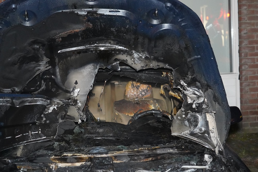 De motorkap raakte doorboord door de vlammen en ook het interieur brandde uit. Nabij geparkeerde auto’s bleven ongedeerd.
