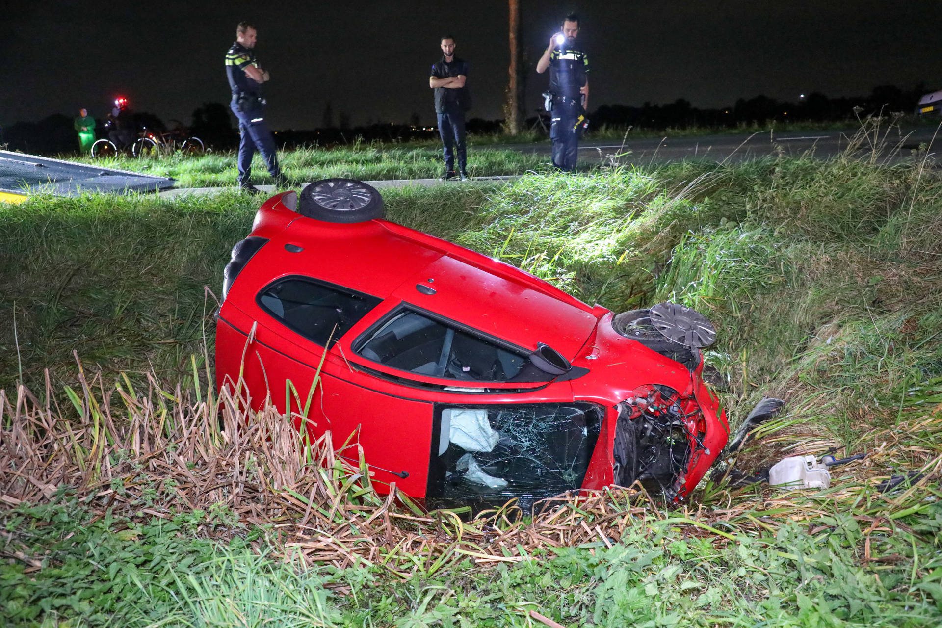 Omstanders schoten direct te hulp en wisten de man uit de auto te bevrijden. Hij is vervolgens met onbekend letsel naar het ziekenhuis gebracht. De auto raakte zwaar beschadigd; de klap op een duiker was zo hevig dat het motorblok bijna losraakte van het chassis.