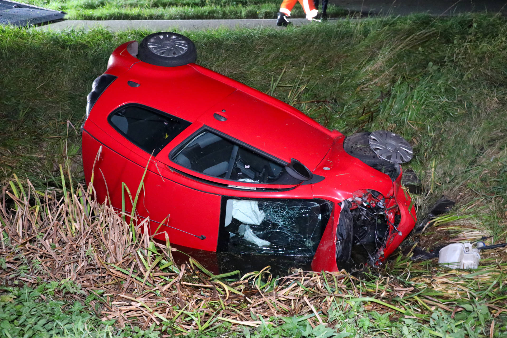Auto op zijn zijkant in de greppel, bestuurder raakt gewond