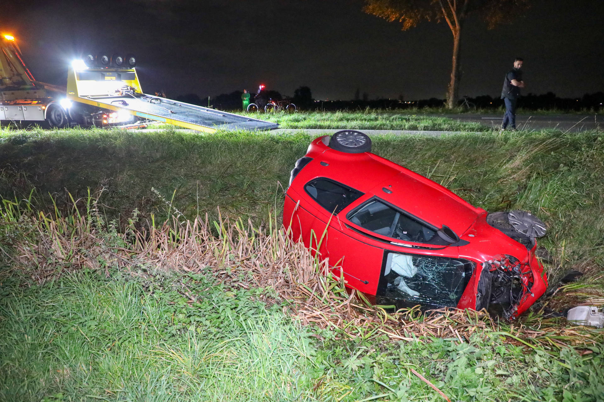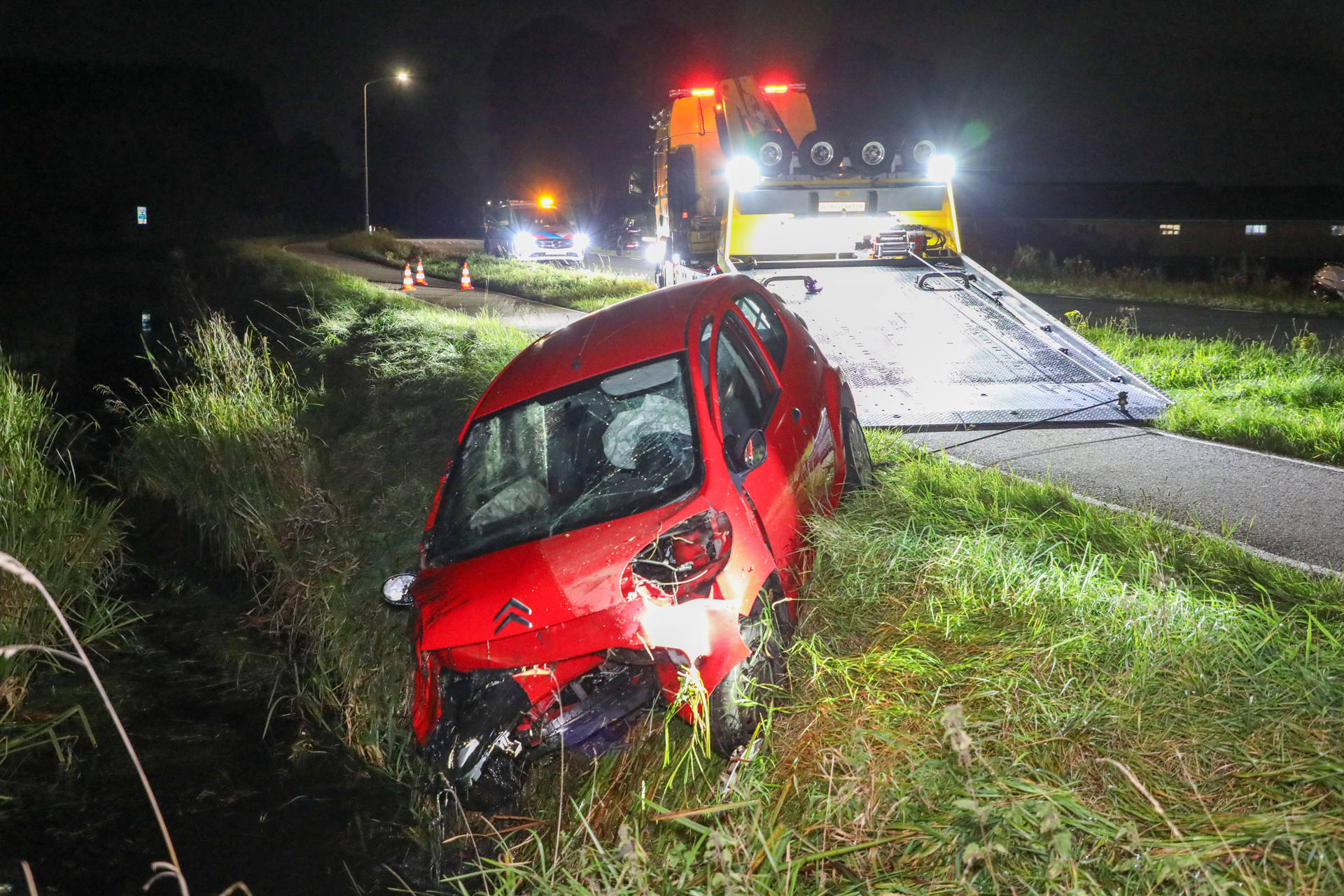 Een bergingsbedrijf heeft het voertuig uit de greppel getakeld. De politie meldt dat de man aanspreekbaar was en veel geluk heeft gehad bij het ongeval.