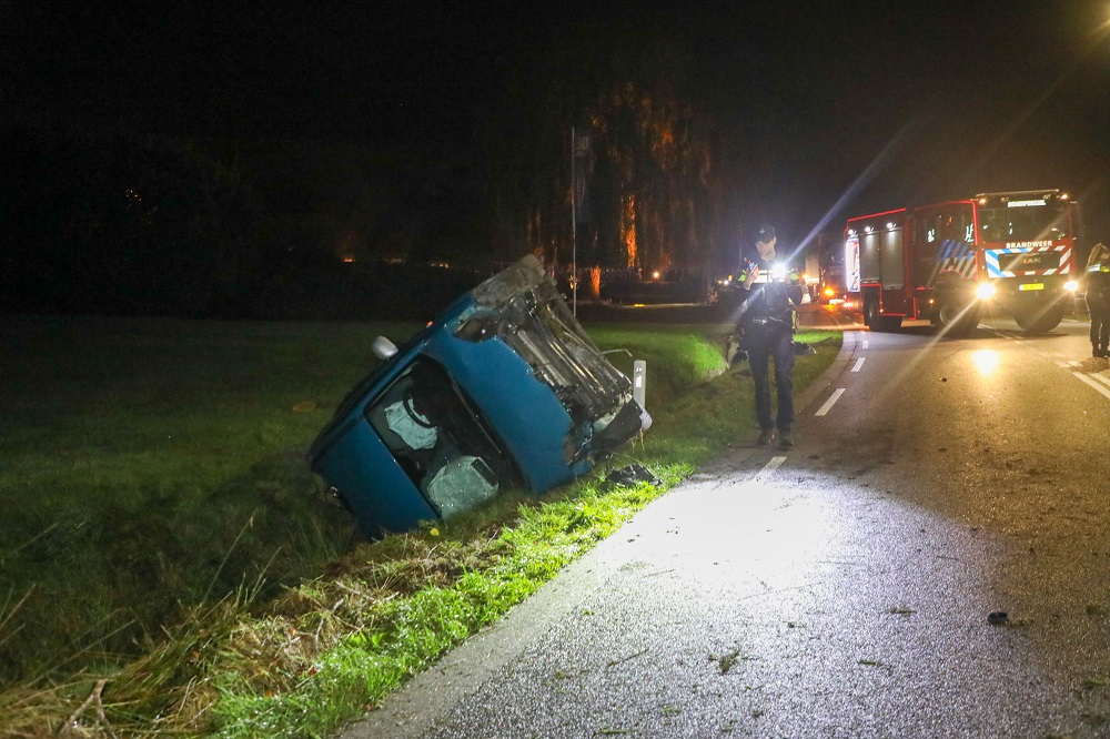 De weg lag bezaaid met brokstukken en zand en werd tijdelijk afgesloten. Ook werd een verkeersbord uit de grond gereden. De zwaar beschadigde auto is door een bergingsbedrijf afgevoerd.