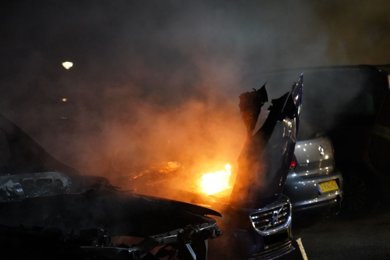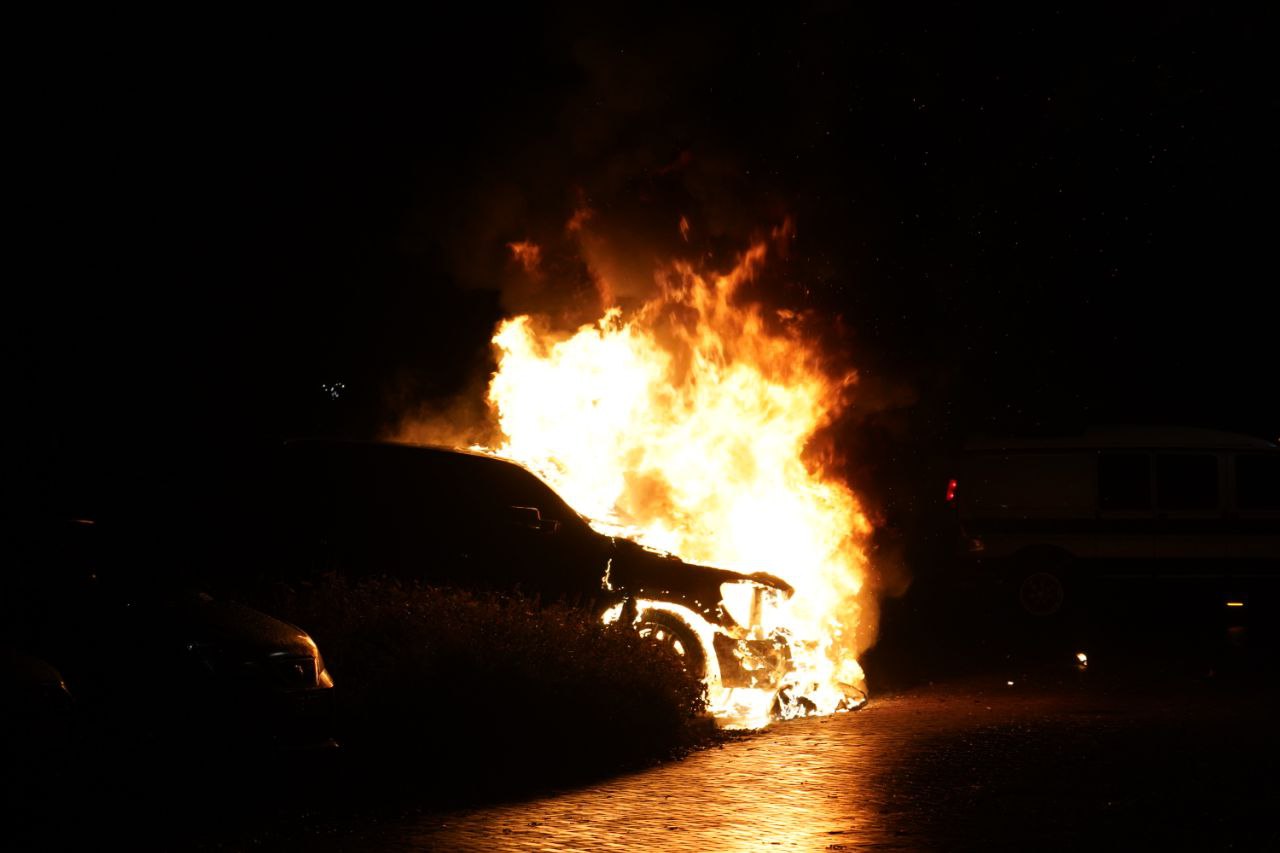 Op een parkeerplaats stond een auto volledig in brand. Door de hitte raakte ook een naastgelegen voertuig zwaar beschadigd. De claxon van deze auto ging langdurig af door de brand. Ondanks de snelle inzet van de brandweer konden beide voertuigen niet worden gered en liepen ze forse schade op.