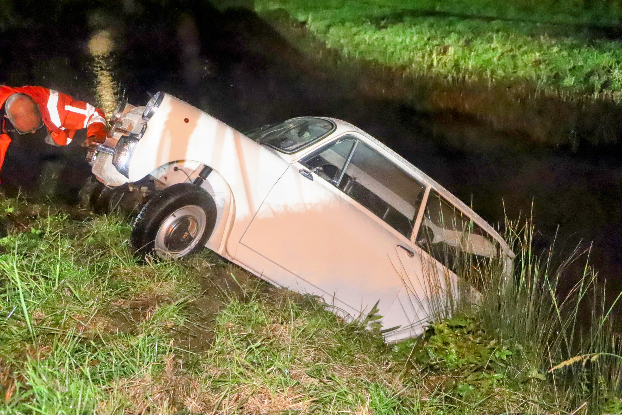 Een berger heeft het klassieke voertuig uit de sloot gehaald.