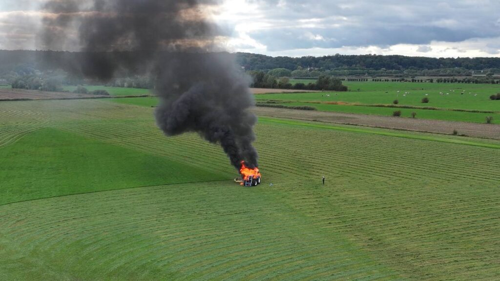 Tractor vliegt in brand op weiland