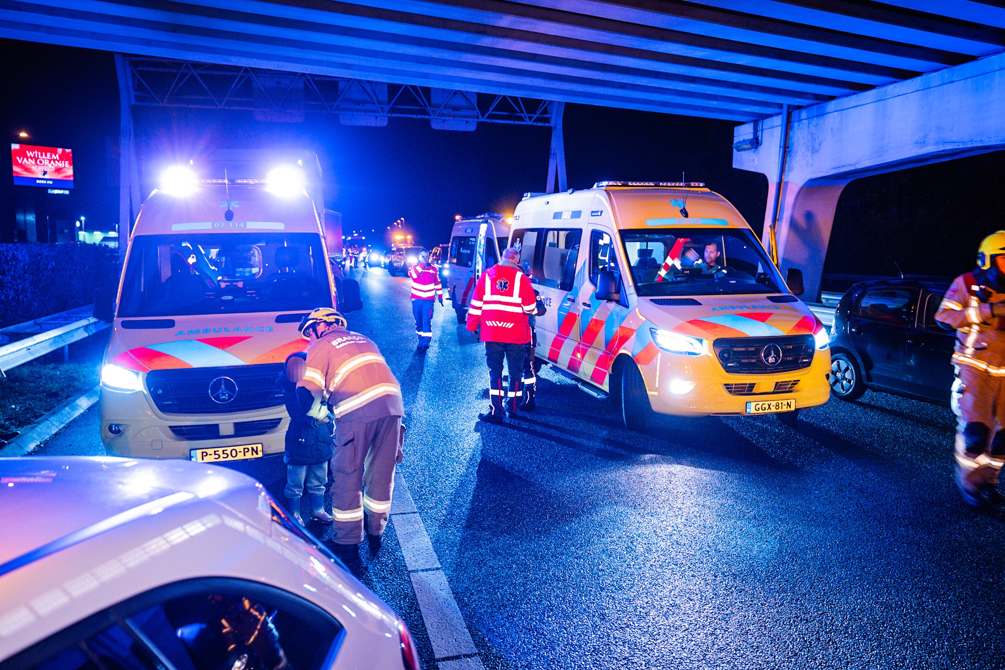 Het ongeval gebeurde in de file richting Duitsland. Vier mensen raakten gewond, onder wie een baby en haar moeder. Alle gewonden zijn met spoed naar het ziekenhuis gebracht. Over de ernst van hun verwondingen is nog niets bekendgemaakt. De snelweg is volledig afgesloten richting de grens.