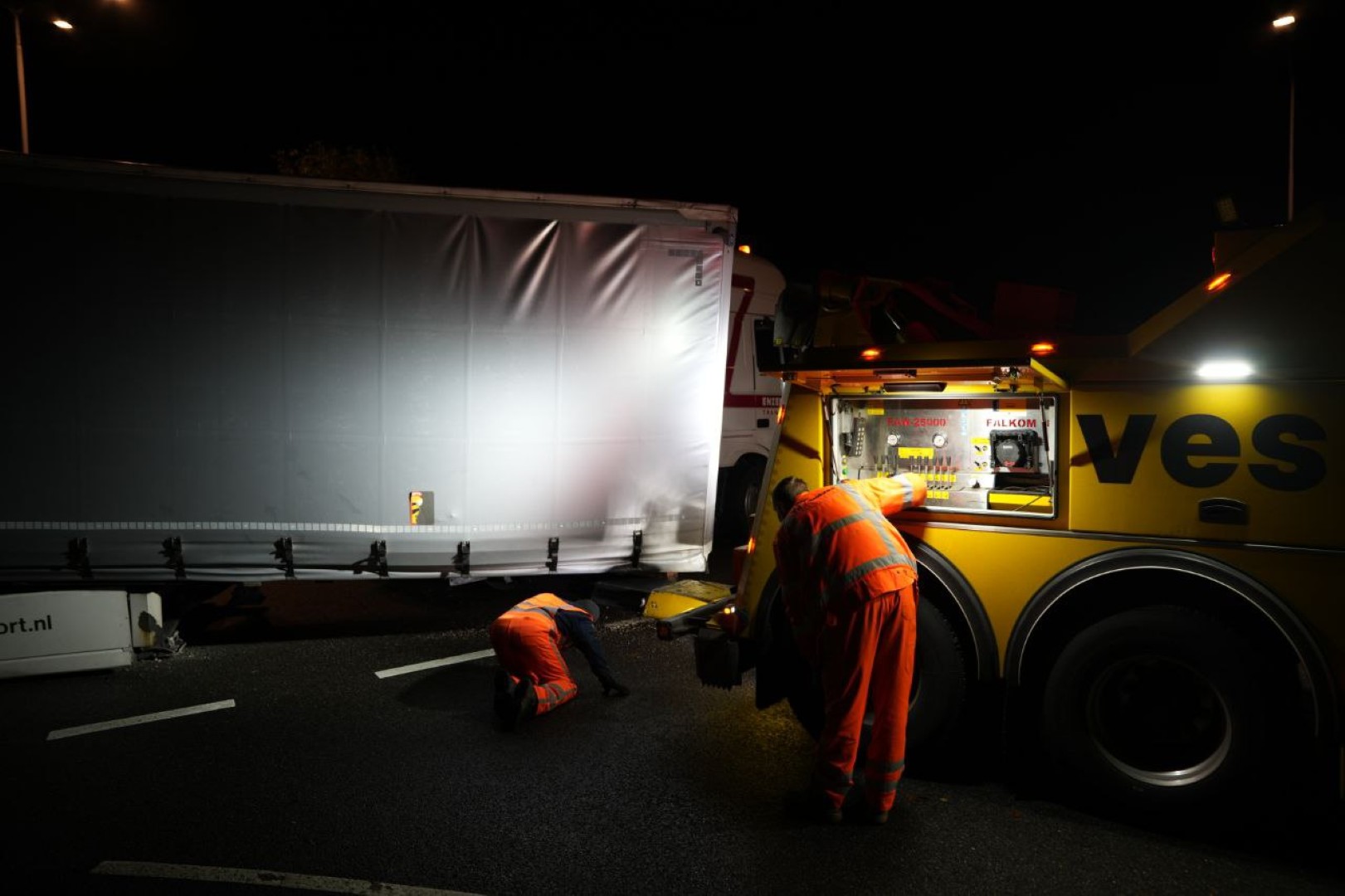 Rond 20.15 uur werd de weg weer volledig vrijgegeven voor verkeer. De oorzaak van het losraken van de oplegger wordt onderzocht.