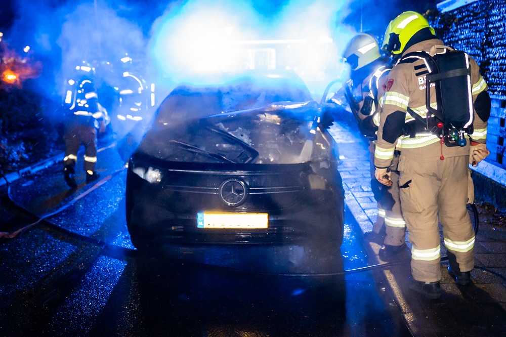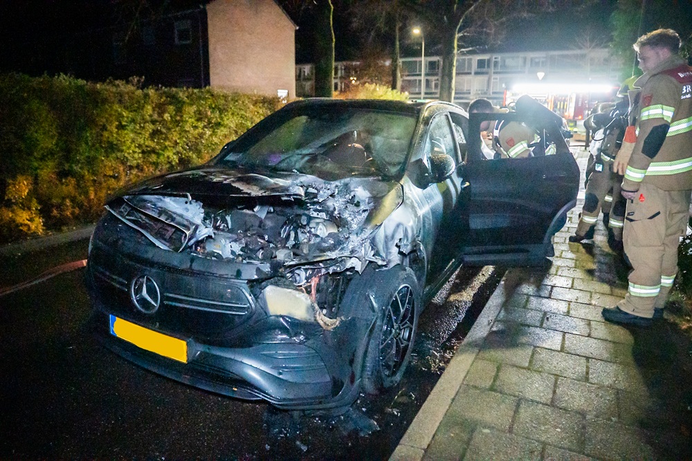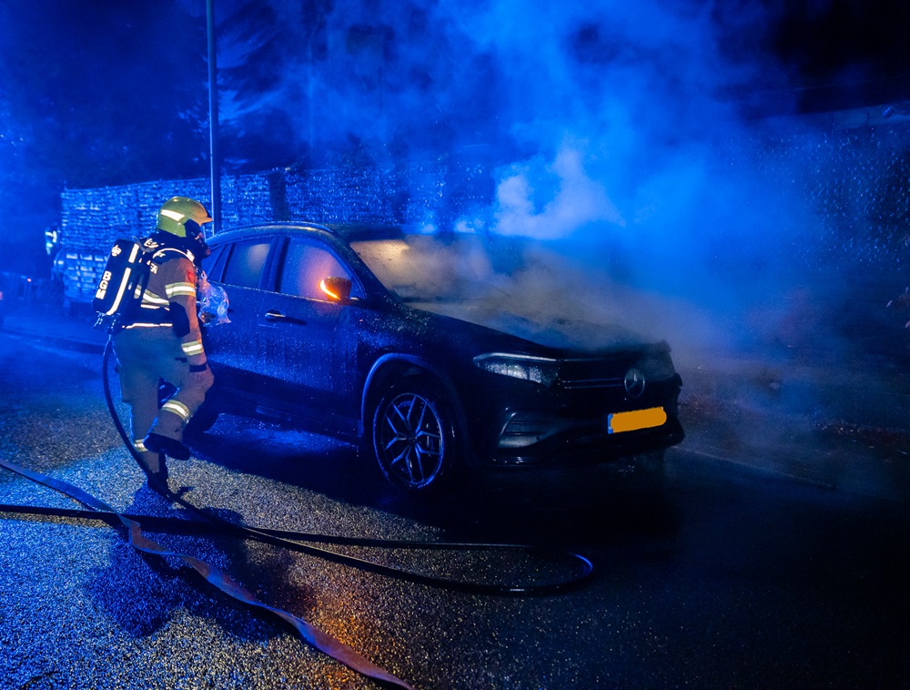 Bij aankomst stond de voorzijde van het elektrische voertuig al volledig in brand. De brandweer kon het vuur blussen, maar de auto raakte aan de voorkant zwaar beschadigd. Vanwege het accupakket van de elektrische auto is langdurig gekoeld om herontsteking te voorkomen.