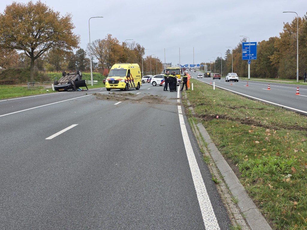 Het voertuig begon te tollen en sloeg over de kop, om vervolgens tot stilstand te komen op de busbaan aan de andere zijde van de weg. De auto was onderweg vanuit Wageningen in de richting van Ede. De bestuurder raakte gewond en moest door de brandweer uit het voertuig worden bevrijd. Hij is per ambulance overgebracht naar het ziekenhuis.