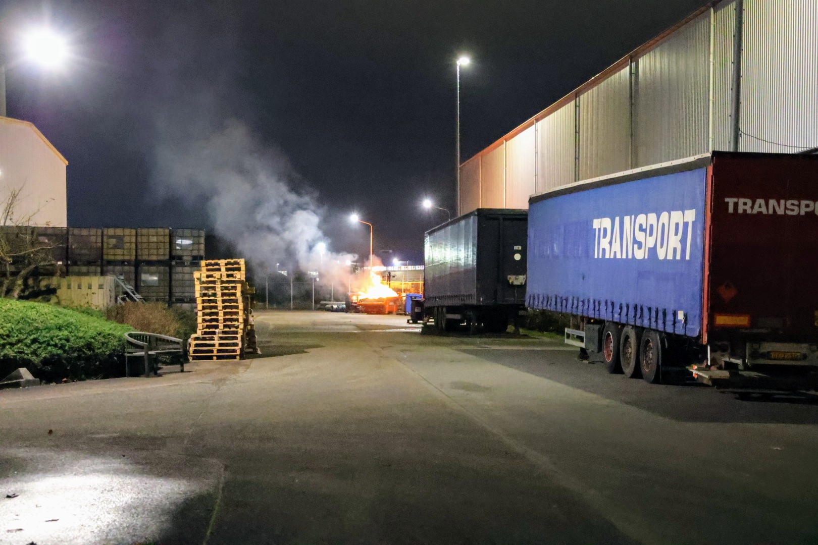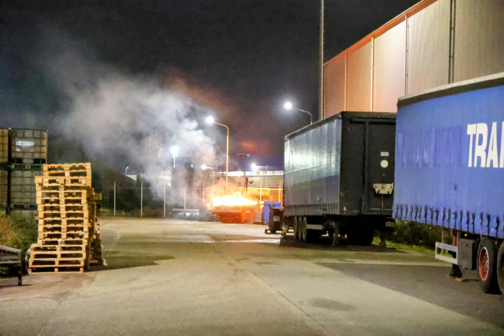 Op het terrein stond een bouwcontainer in brand. De vlammen sloegen uit de container bij aankomst van de brandweer.