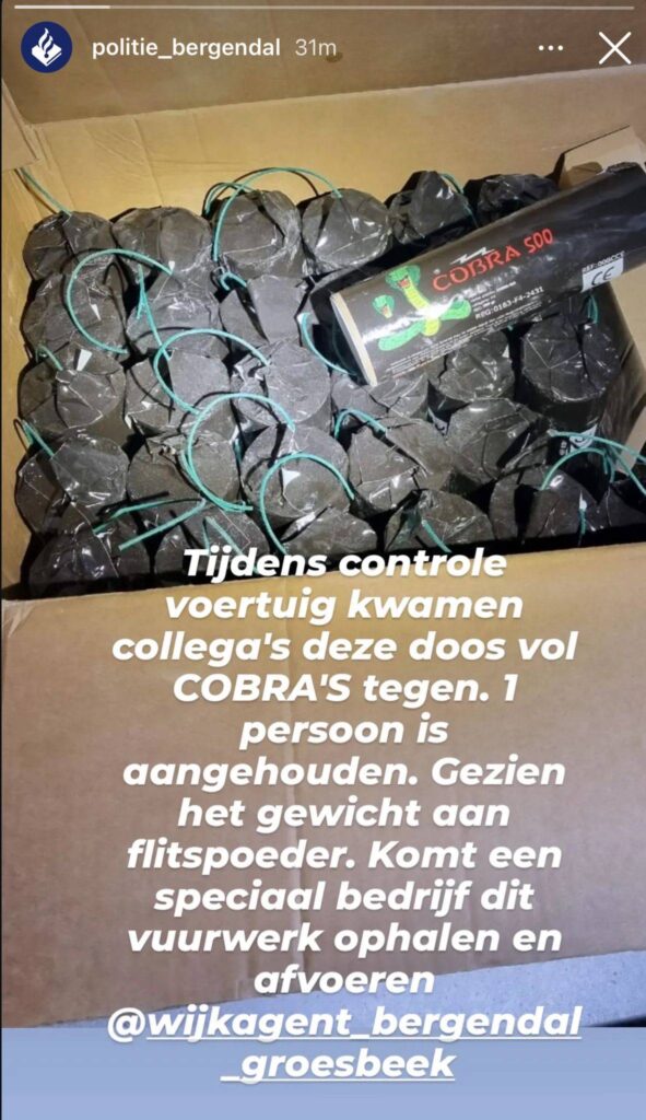 Uit voorzorg is een ruim gebied rond het voertuig met lint afgezet. De situatie is daarmee veiliggesteld. De Explosieven Opruimingsdienst Defensie (EOD) is onderweg om het vuurwerk professioneel veilig te stellen en af te voeren. Volgens een aanvullende melding gaat het in dit geval om zelf gefabriceerde Cobra’s die voor illegale doeleinden worden gebruikt. Daarom is ook de forensische opsporing opgeroepen.
