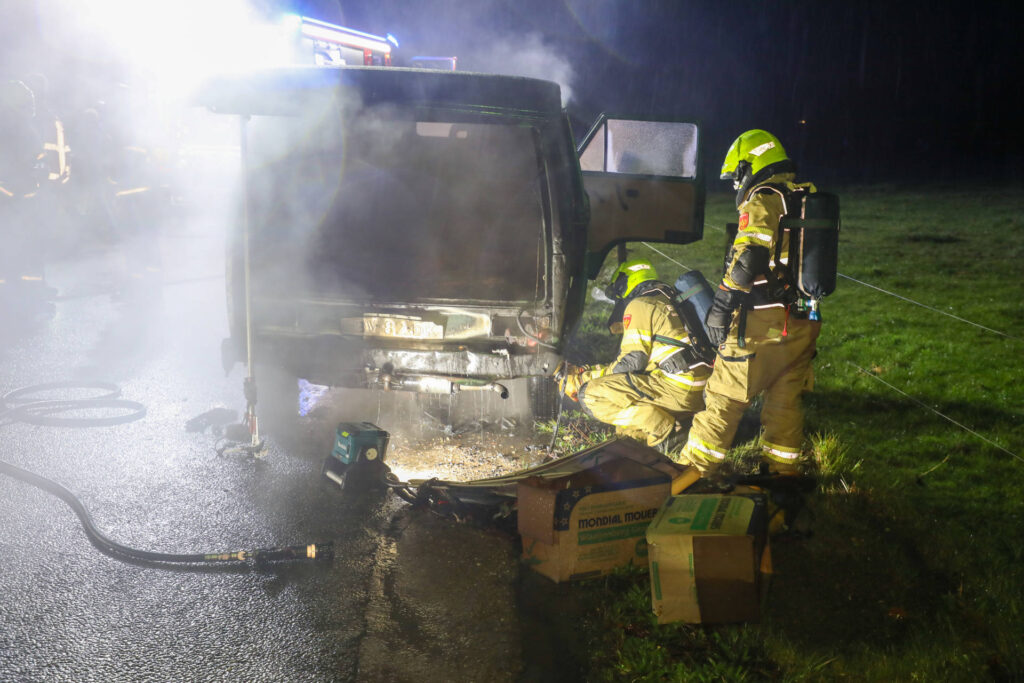 Het echtpaar kwam met de schrik vrij en is door een voorbijganger naar huis gebracht. De bestelbus wordt door een bergingsbedrijf afgesleept. De brandweer heeft het voertuig tijdelijk van de donkere weg gehaald om verdere risico’s te voorkomen.