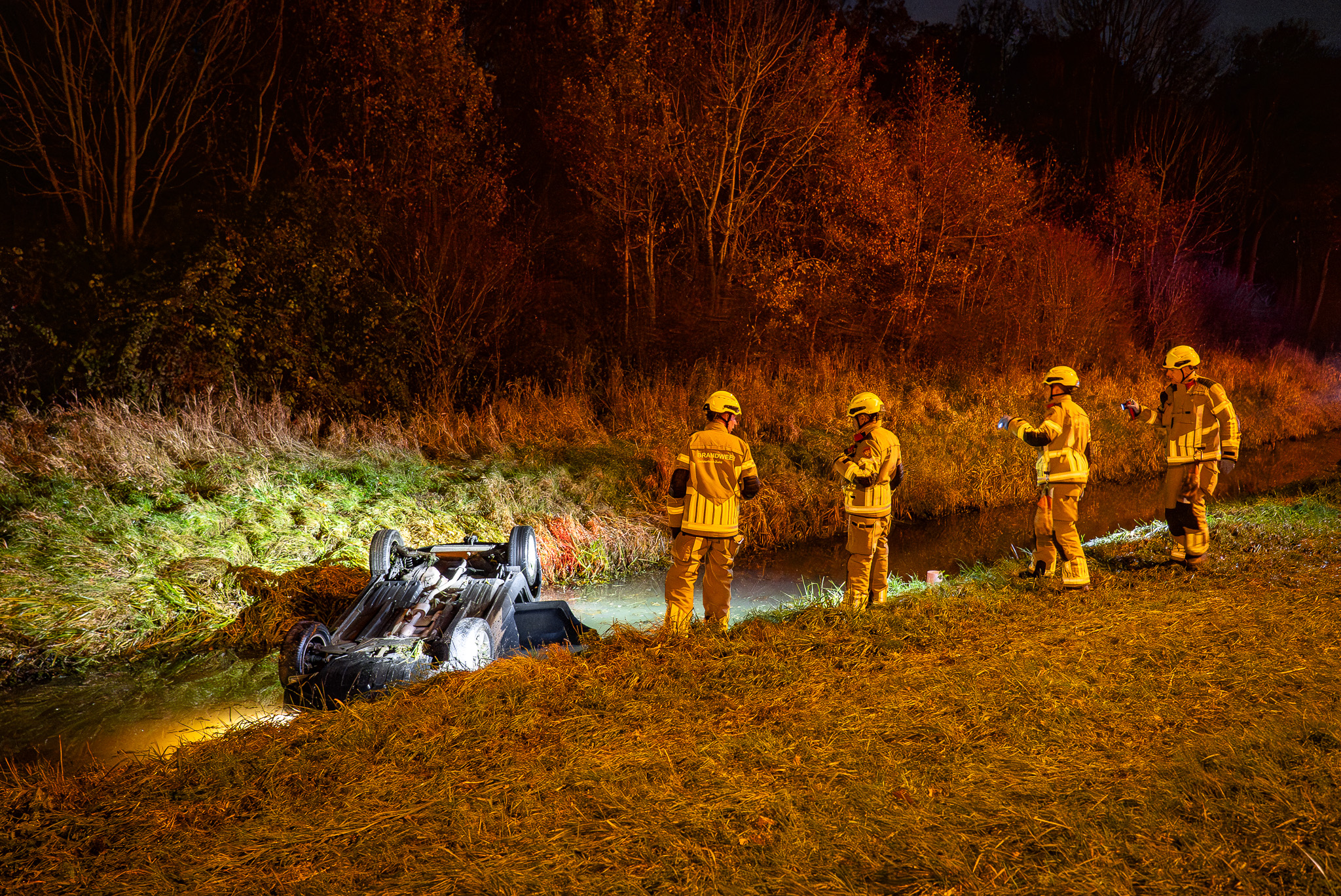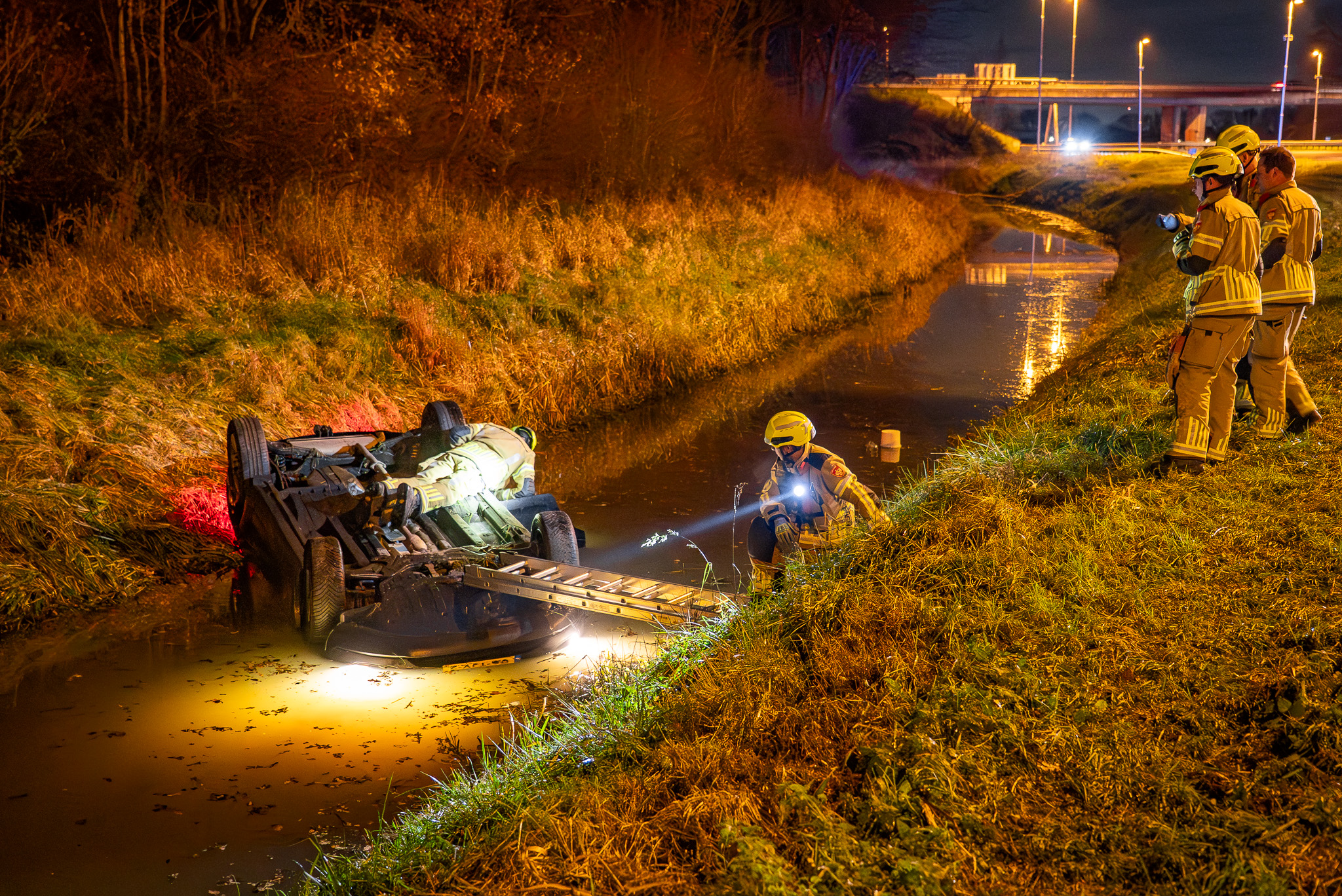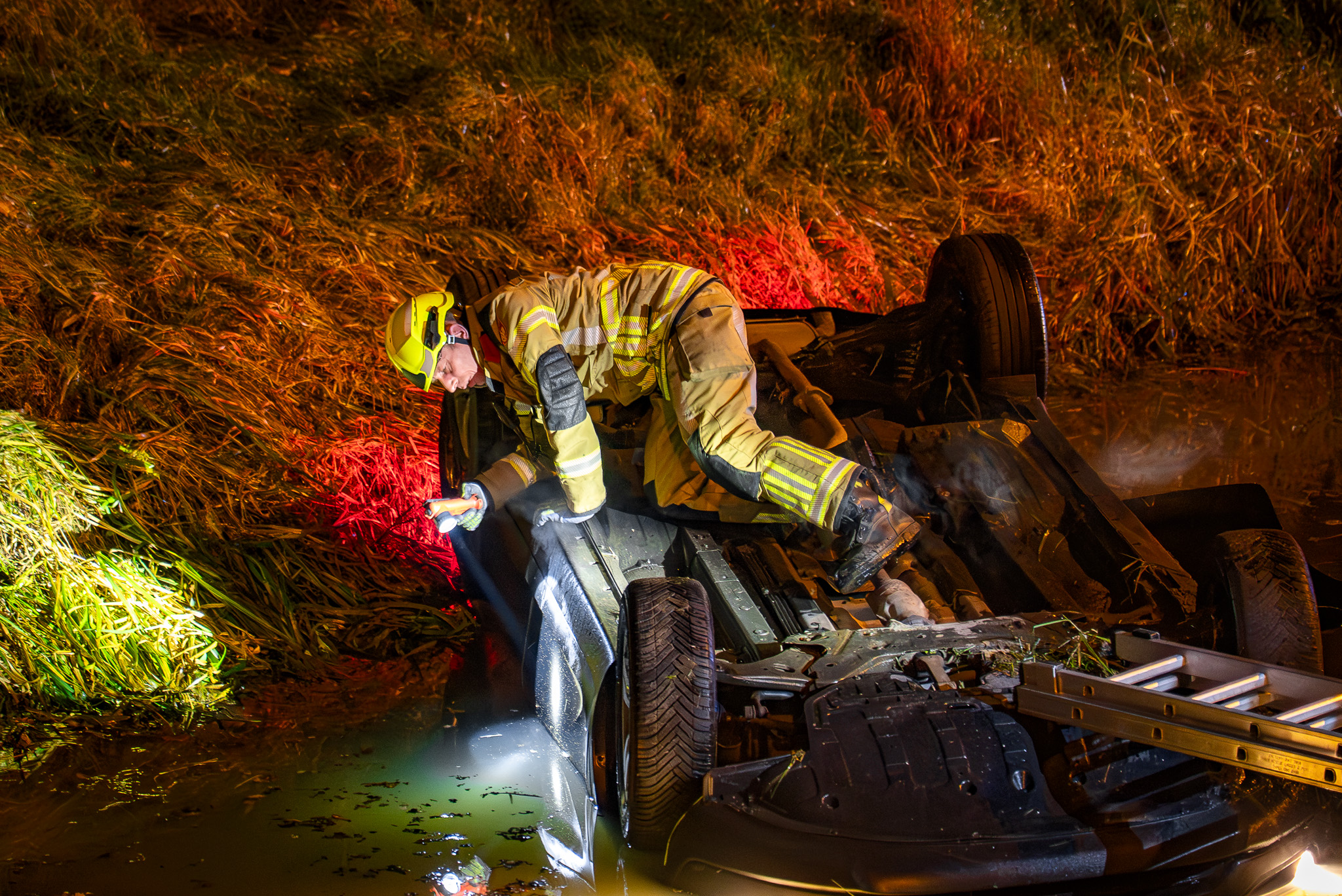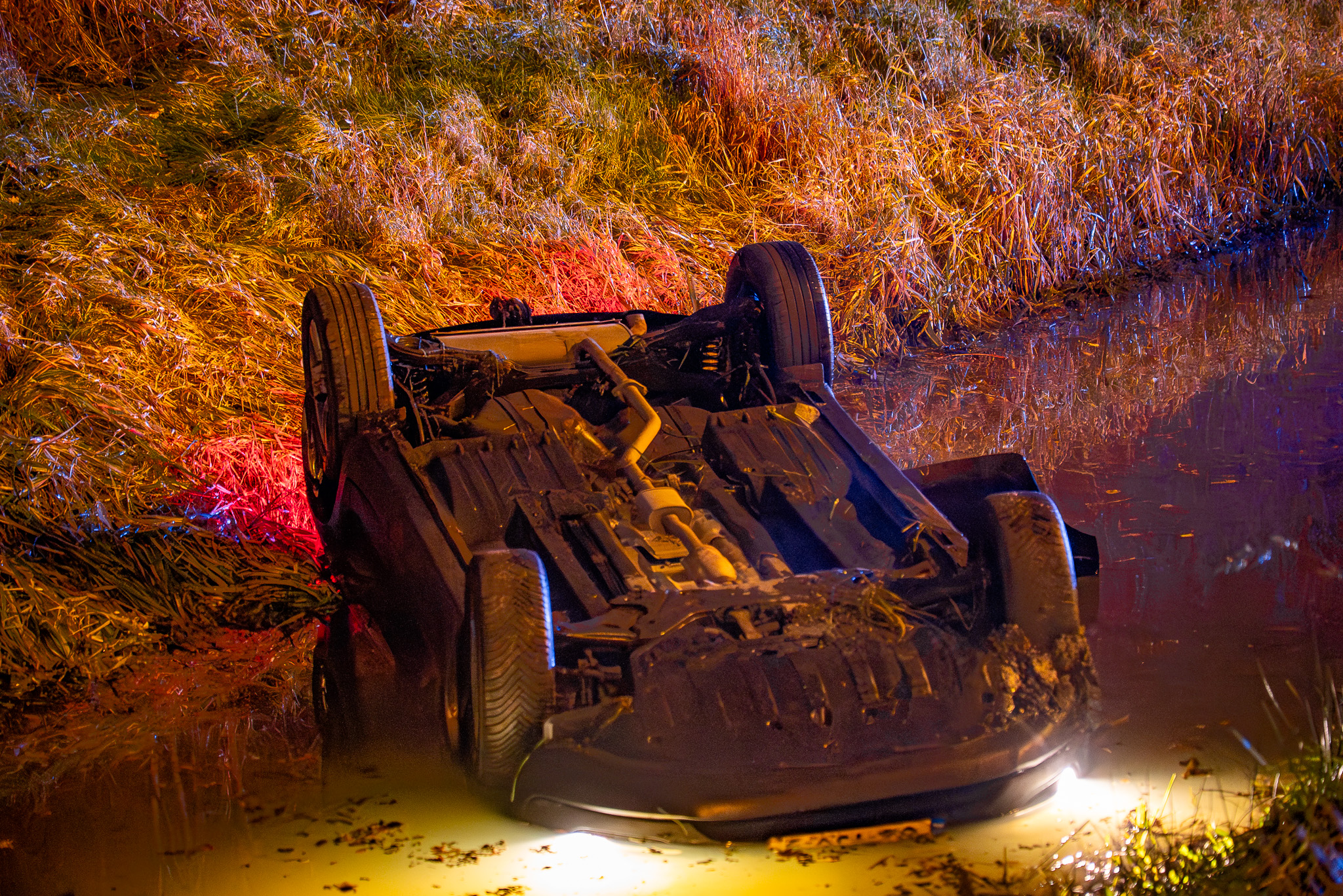 Auto raakt vangrail en komt op de kop in sloot terecht