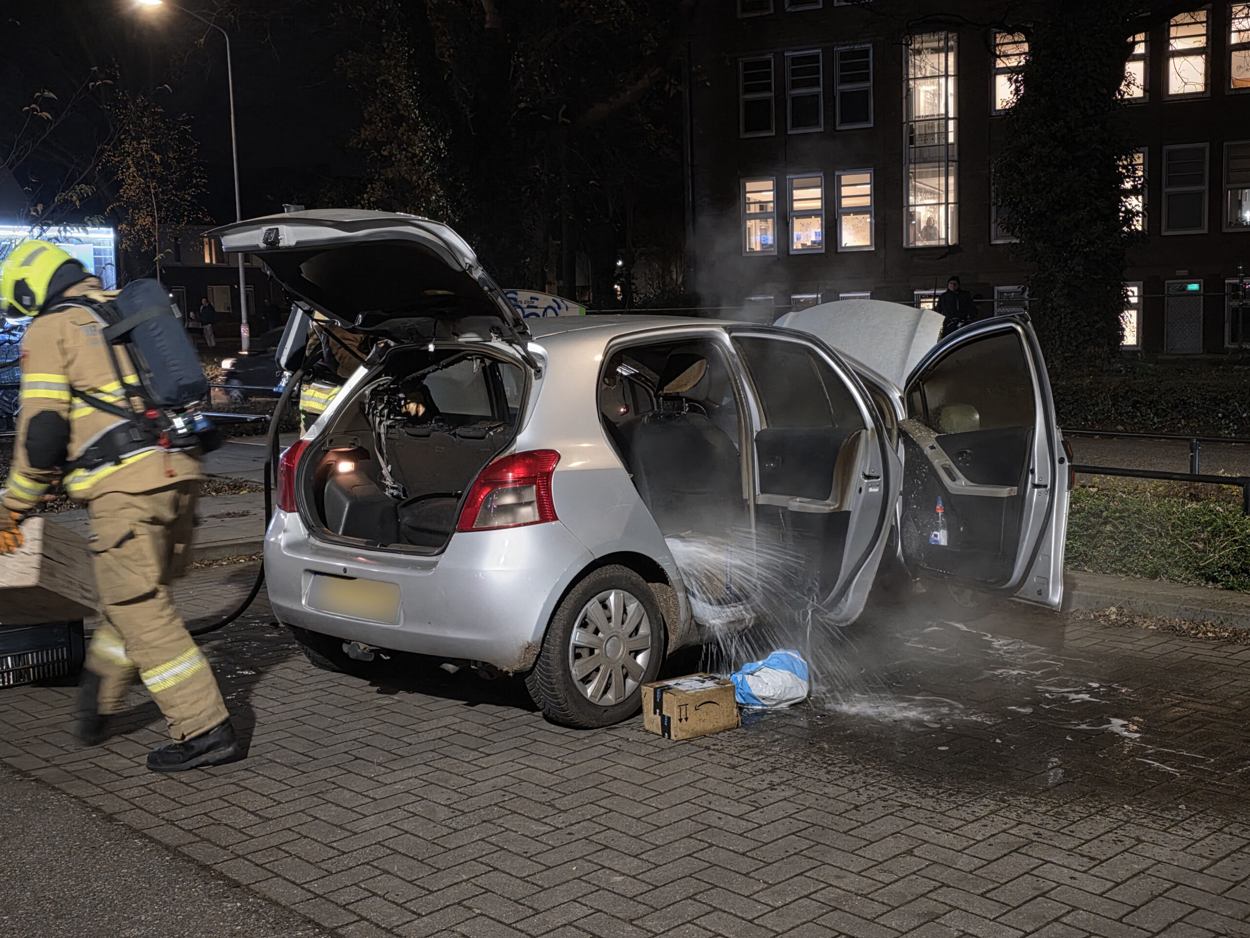 Geparkeerde auto in lichterlaaie; omstanders grijpen in