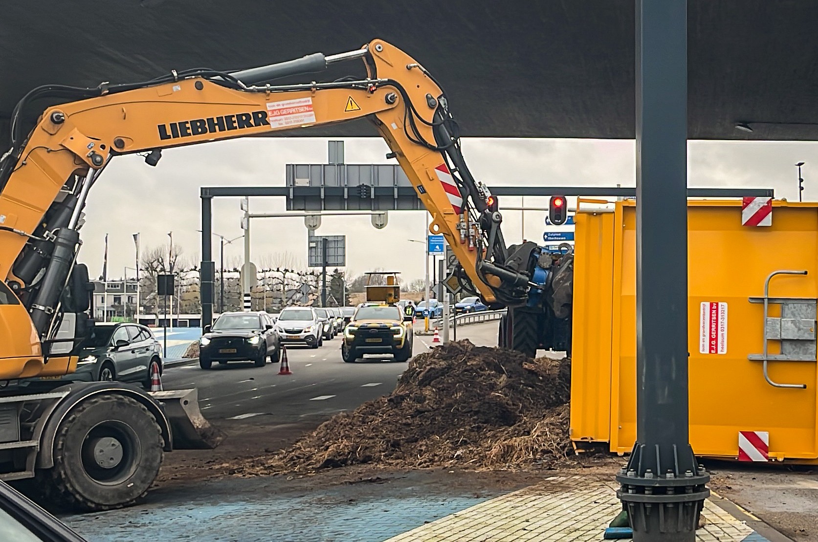 De aanhanger met mest kwam door nog onbekende oorzaak op zijn kant terecht. De mest verspreidde zich over het wegdek, wat voor hinder zorgde op de doorgaande route.