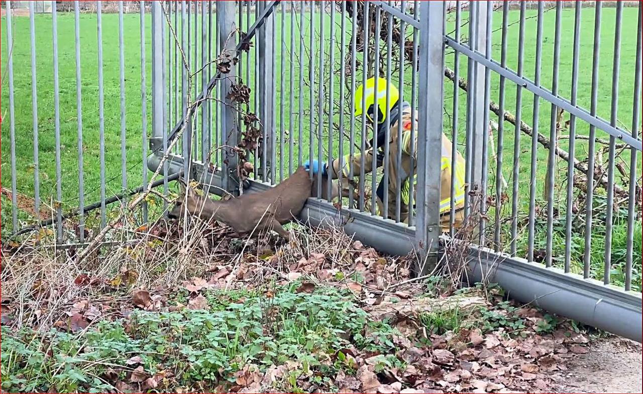 ERLECOM – Donderdagochtend is aan de Erlecomseweg in Erlecom een ree in nood aangetroffen. Het dier zat vast tussen een hekwerk en werd ontdekt door een voorbijganger, die direct de brandweer alarmeerde.