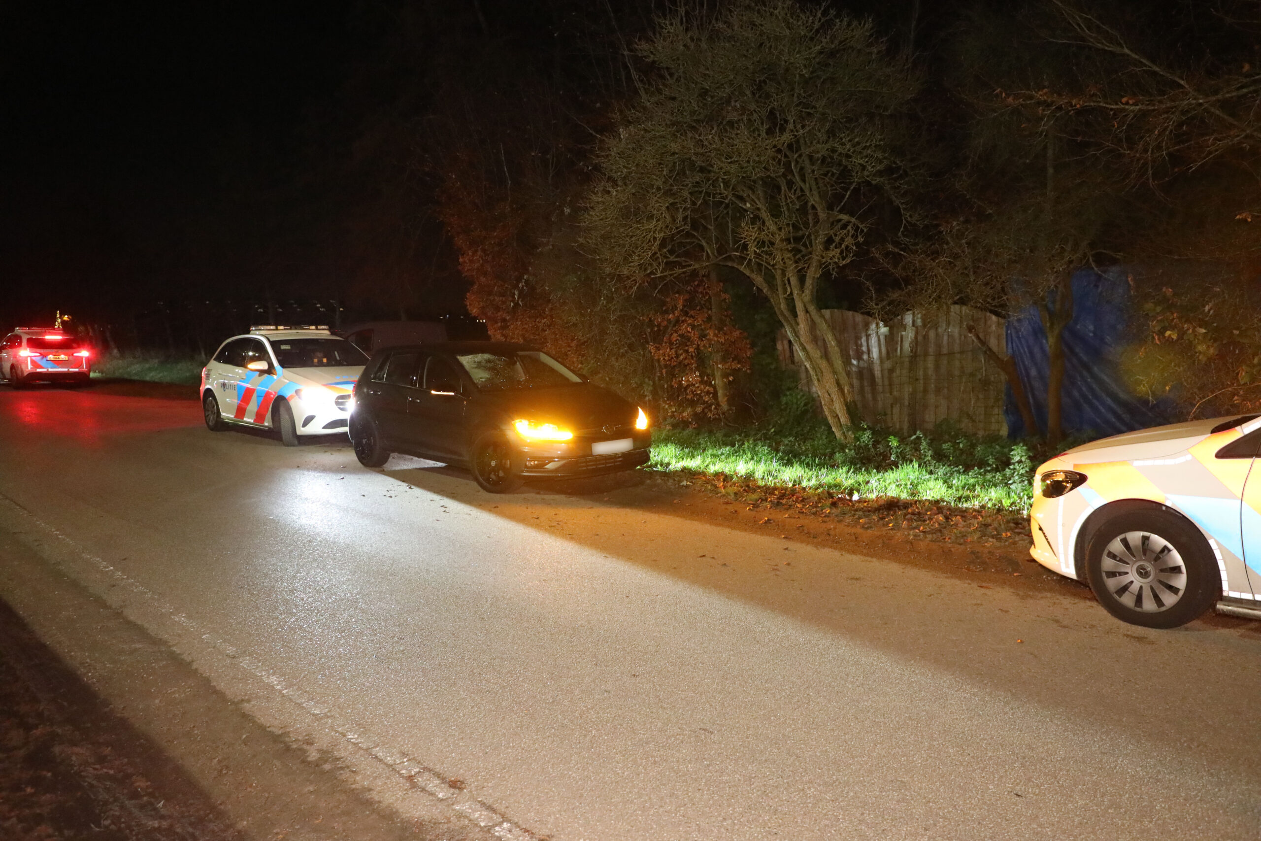 Verderop aan dezelfde weg werd een beschadigde Volkswagen Golf aangetroffen ter hoogte van een woning. Een man die zich in het huis bevond is aangehouden en meegenomen naar het bureau. Later werd ook een vrouw meegenomen. De politie onderzoekt de betrokkenheid van beide personen en verricht sporenonderzoek bij het voertuig.