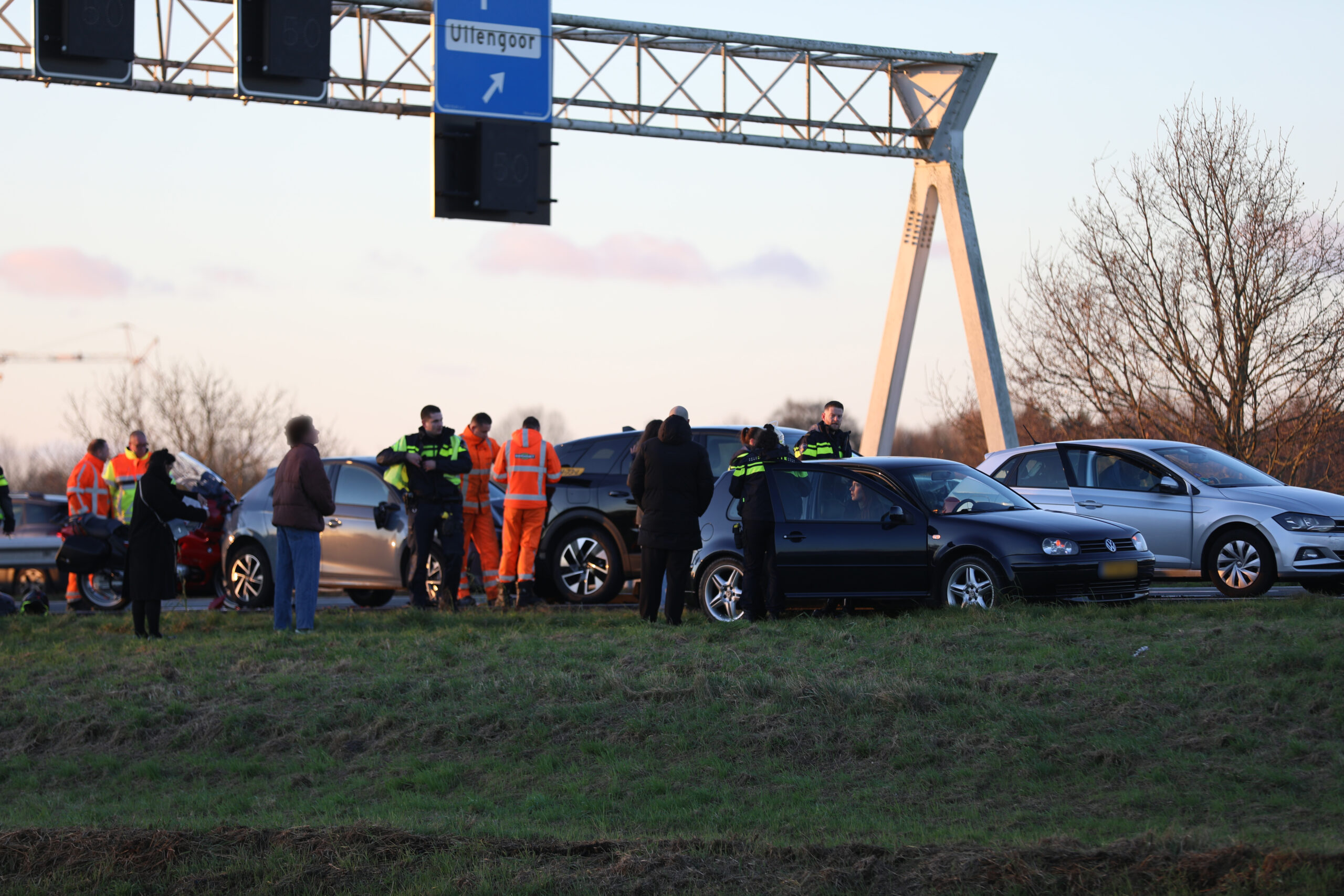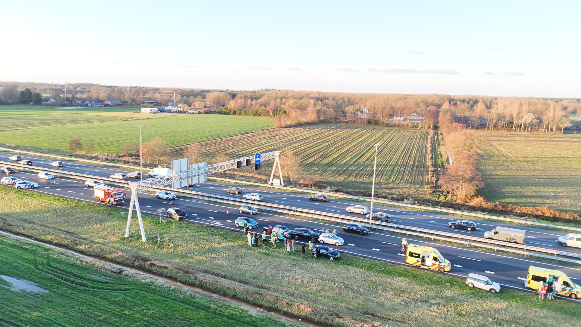 TERSCHUUR – Op de A1 ter hoogte van de uitvoegstrook naar de A30 heeft zich woensdagmiddag een zware aanrijding voorgedaan. Meerdere personenauto’s en een motorrijder kwamen daarbij met elkaar in botsing, wat leidde tot een grote ravage op de weg.