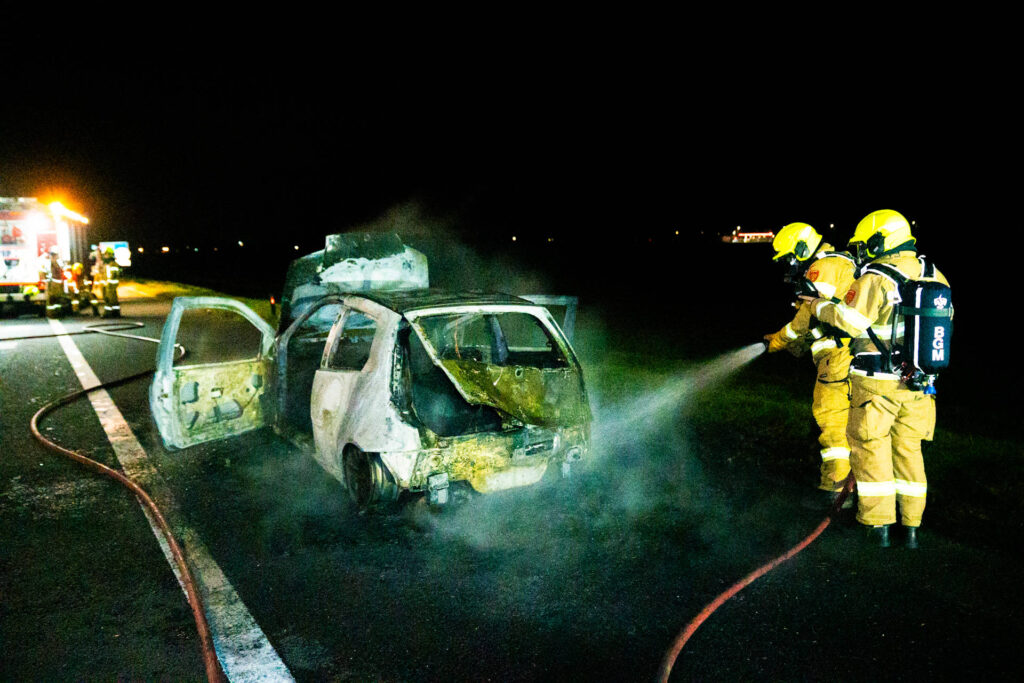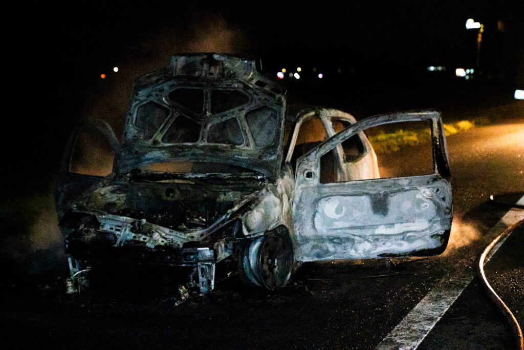 Bij aankomst stond het voertuig al volledig in brand. De brandweer had het vuur snel onder controle, maar van de auto bleef weinig over. Een berger heeft het uitgebrande wrak later afgevoerd.