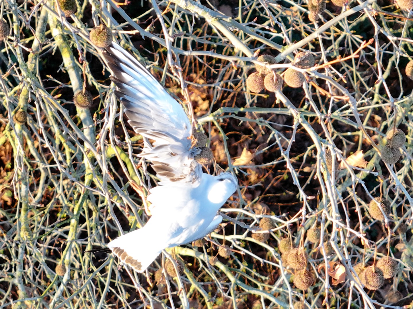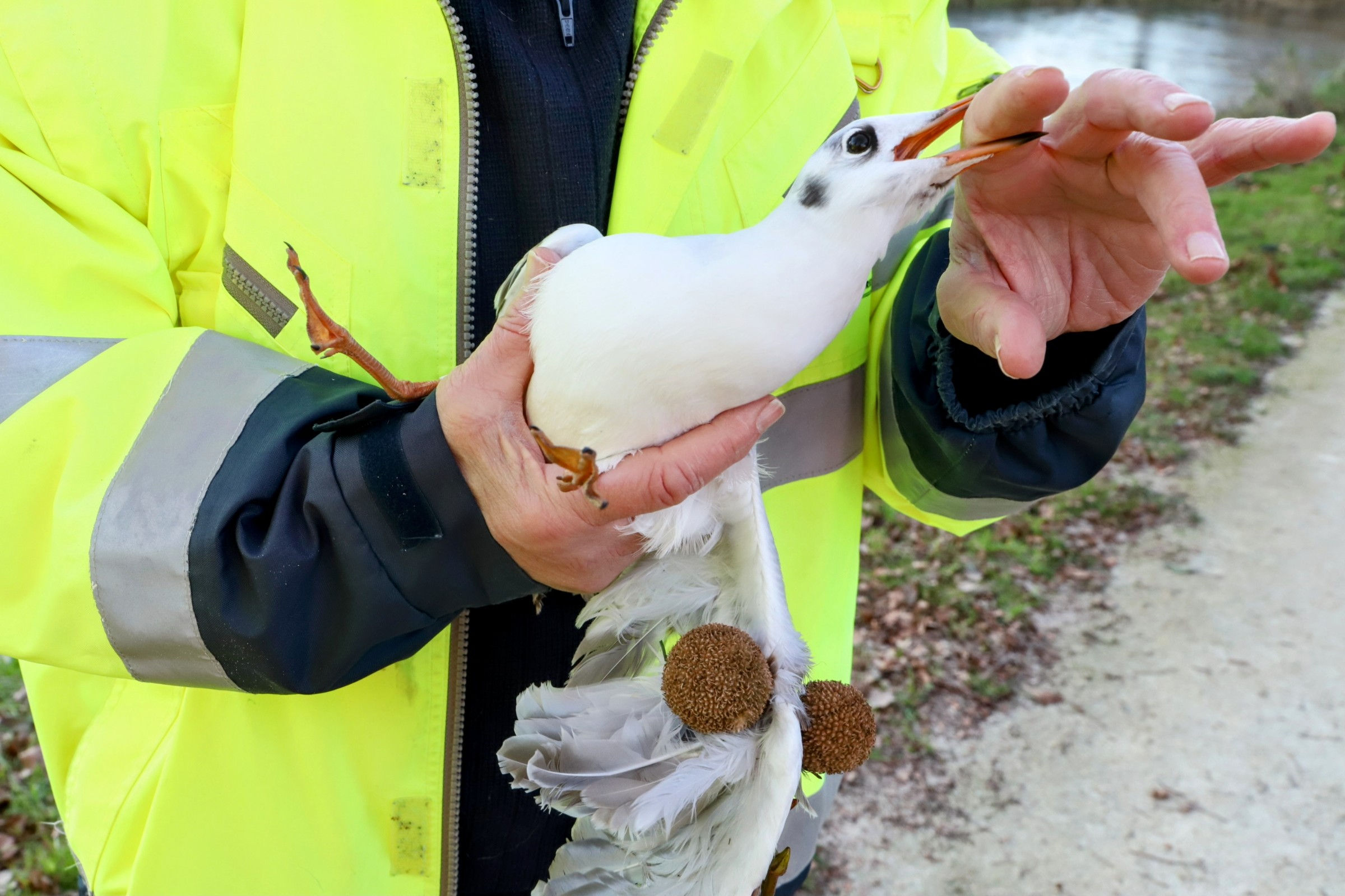 De dierenambulance kwam ter plaatse na een melding over de vastzittende vogel. Omdat de meeuw onbereikbaar was, werd de hulp van de brandweer ingeschakeld. Met behulp van een drone werd vastgesteld dat het dier met een vleugel klem zat tussen de vruchten van de boom. Om de meeuw te bevrijden, klom een brandweerman in de boom en zaagde een grote tak weg.