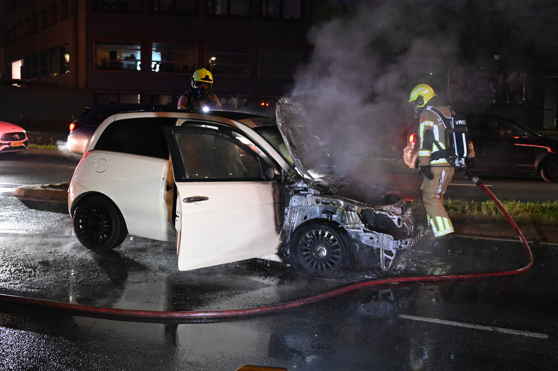 De bestuurder merkte tijdens een proefrit dat er plotseling vlammen onder de motorkap vandaan kwamen. Het voertuig werd direct tot stilstand gebracht, waarna de brandweer werd ingeschakeld. Ondanks de snelle inzet brandde de auto aan de voorzijde volledig uit. Een bergingsbedrijf is onderweg om het uitgebrande voertuig af te slepen.
