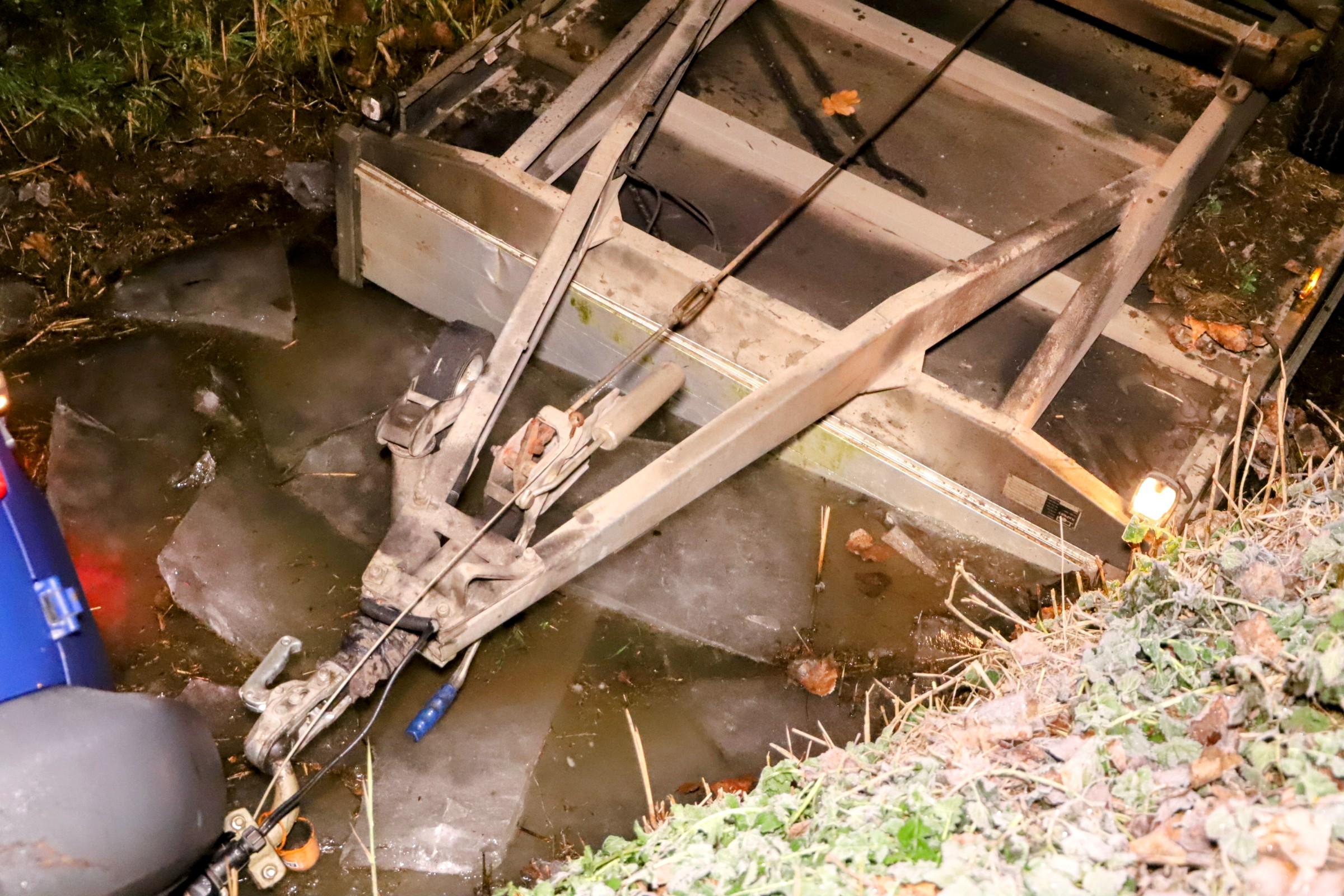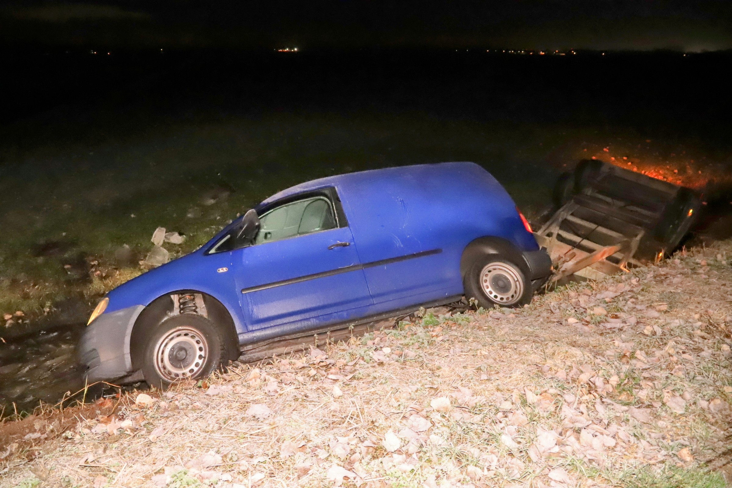 Bestelwagen met aanhanger in sloot door spekgladde weg