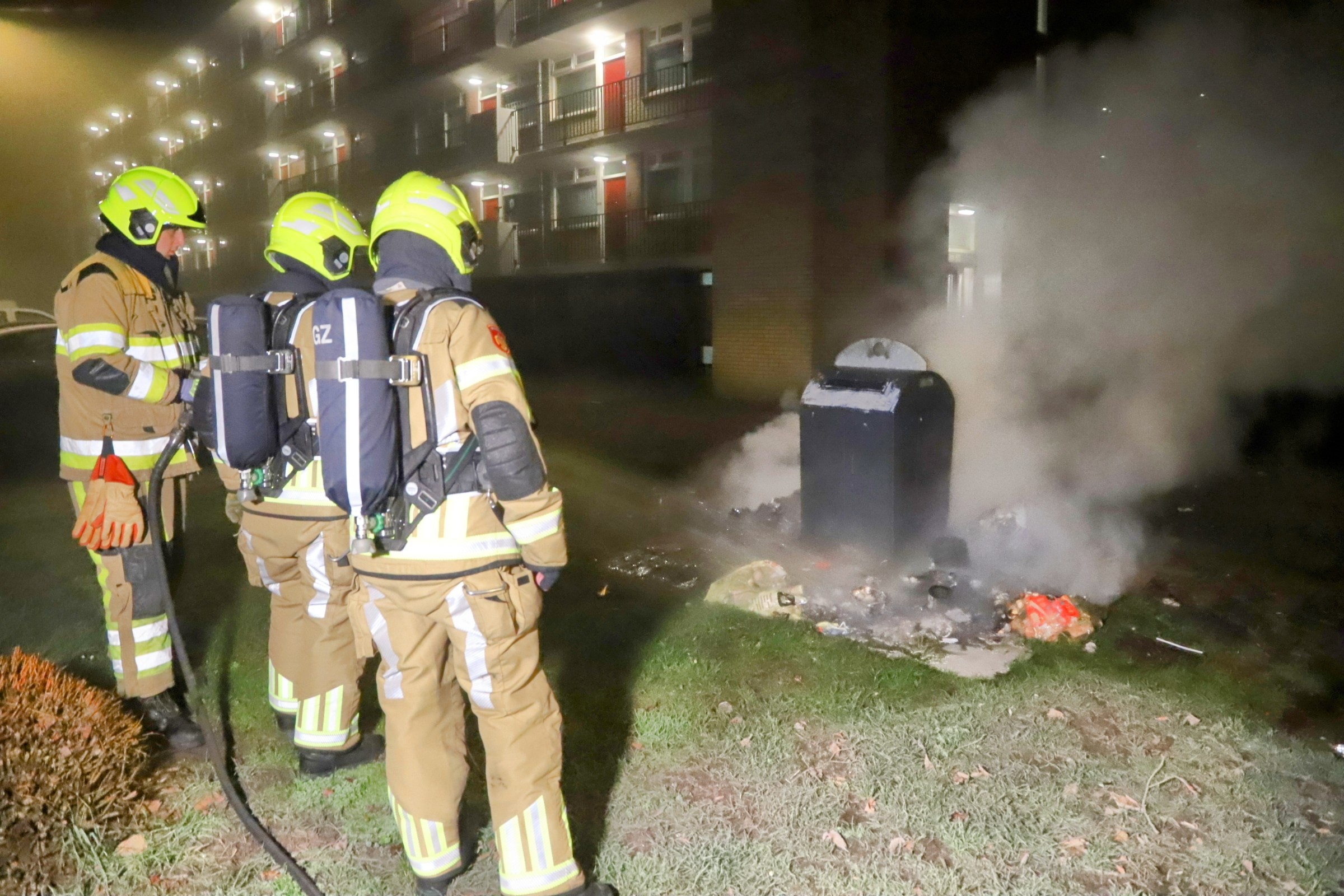 Aan het einde van de straat, bij de achterste flat, stond een hoeveelheid afval naast de container in brand. Het vuur had zich inmiddels uitgebreid naar de container zelf.