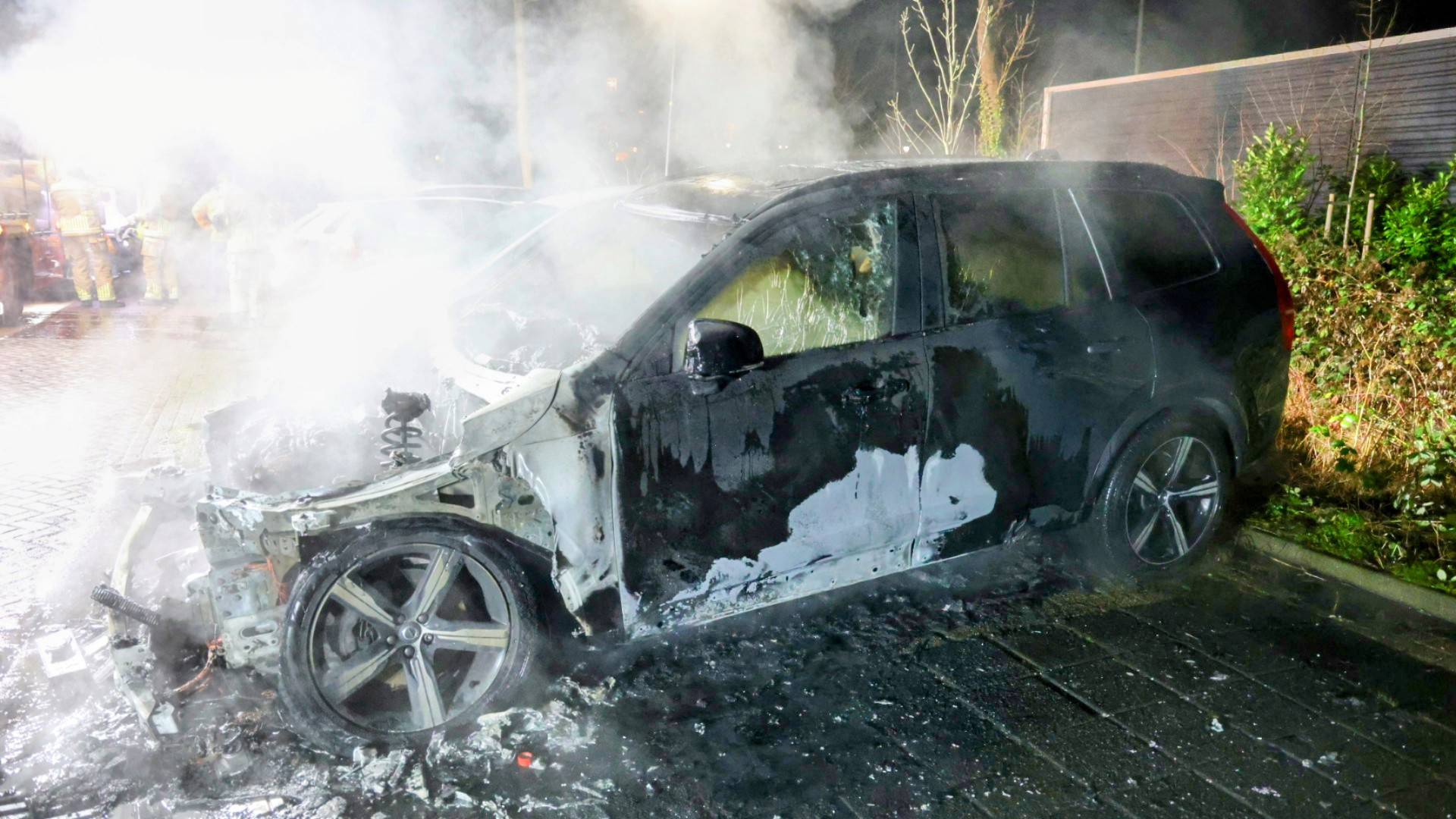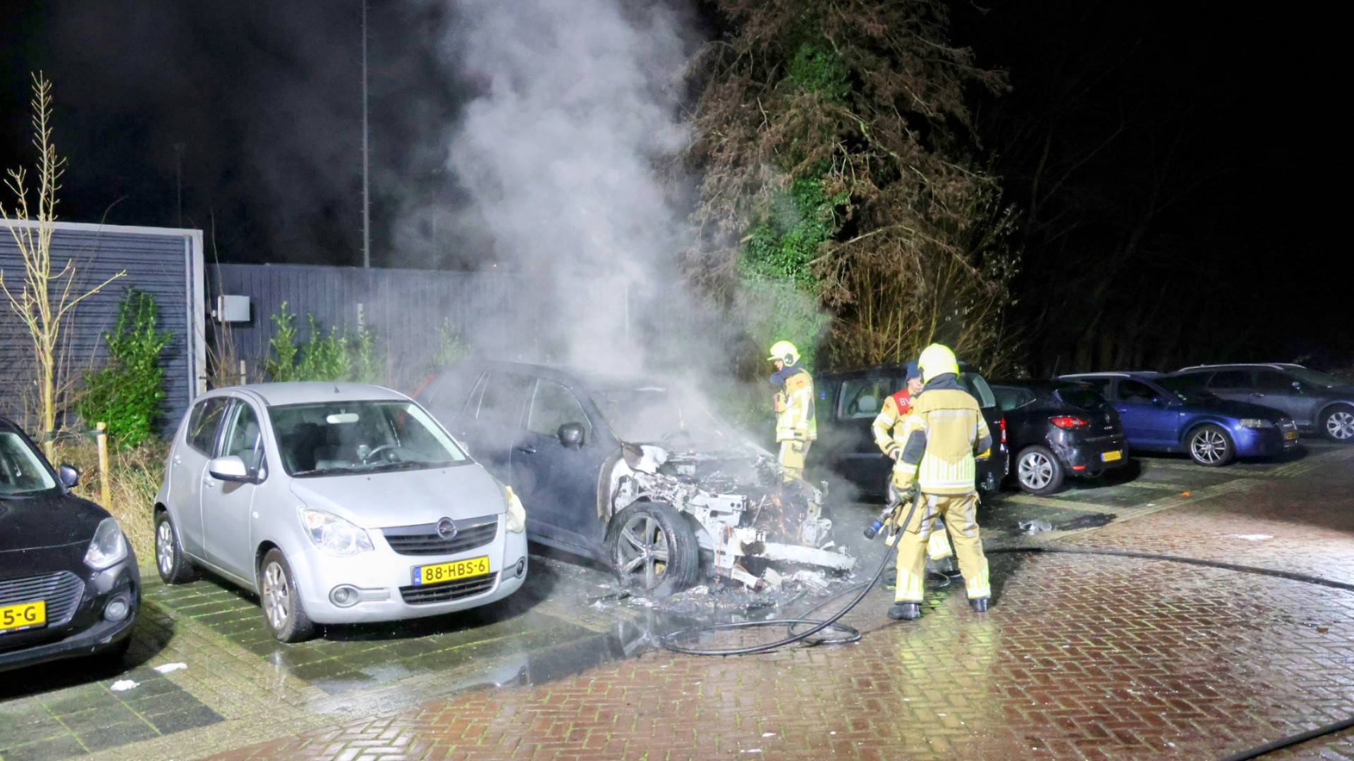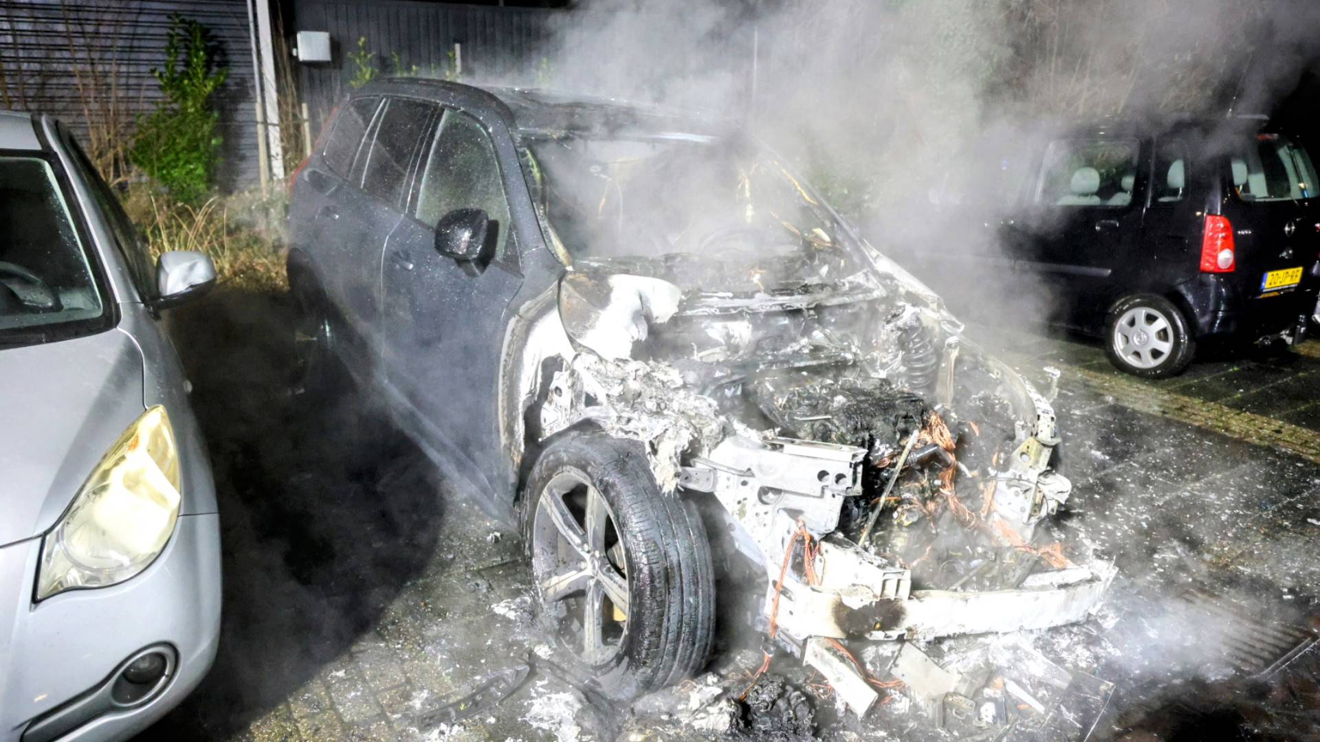 Auto brandt volledig uit op parkeerplaats, naastgelegen voertuig beschadigd