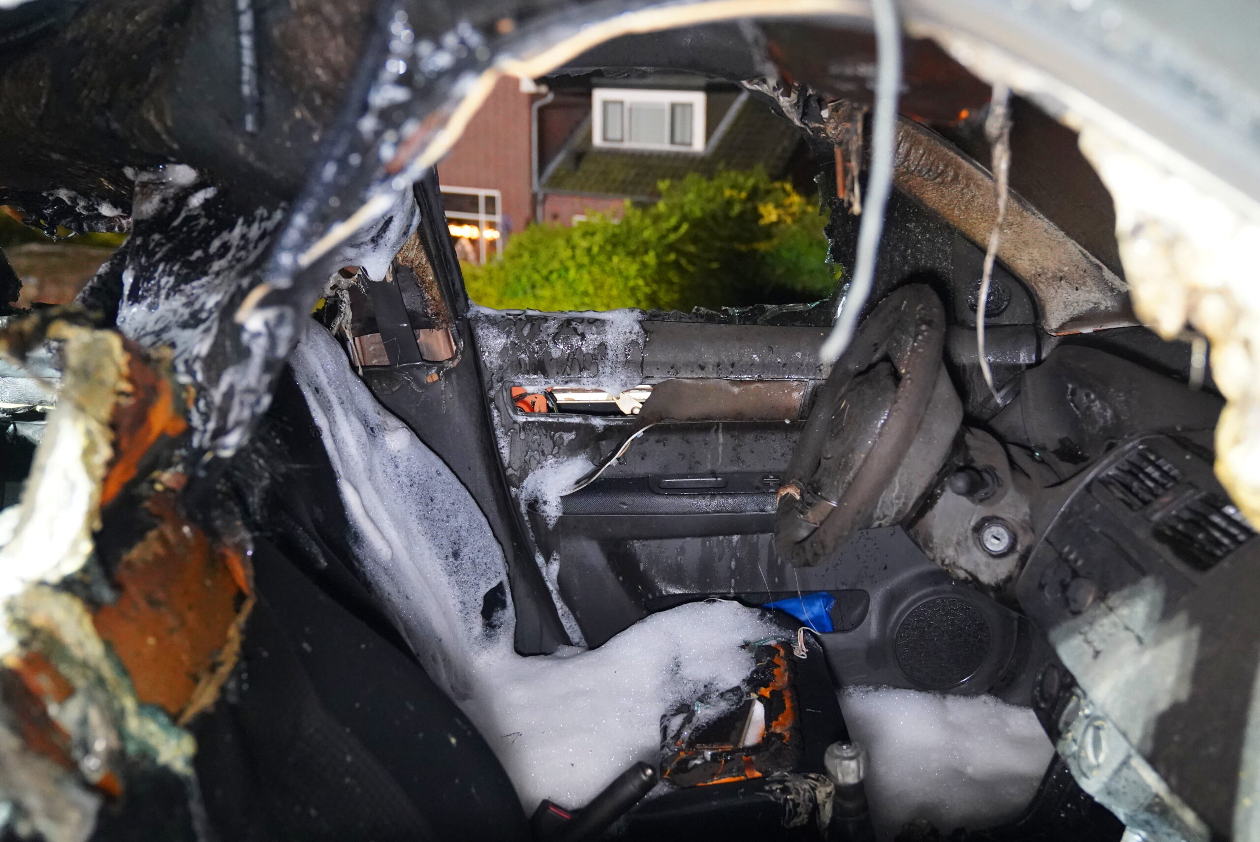 Enkele meters verderop werd onder een andere auto een vloeistof opgemerkt. Daar bleek de brandstoftank te zijn opengeboord, vermoedelijk voor brandstofdiefstal. Ook bij het uitgebrande voertuig is mogelijk de tank opengeboord, waarbij vermoedelijk een vonk de brand heeft veroorzaakt.