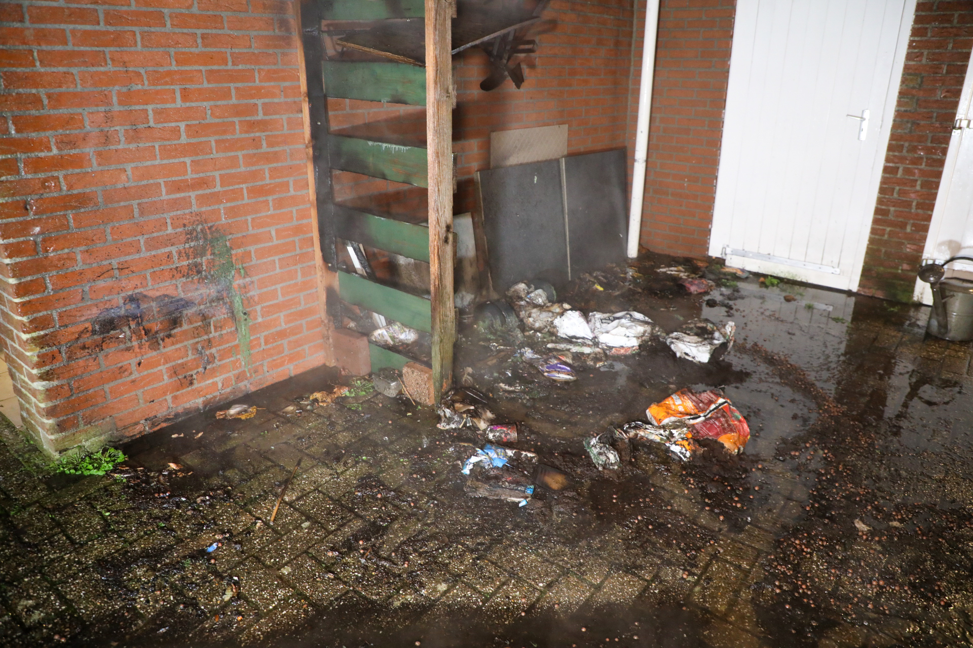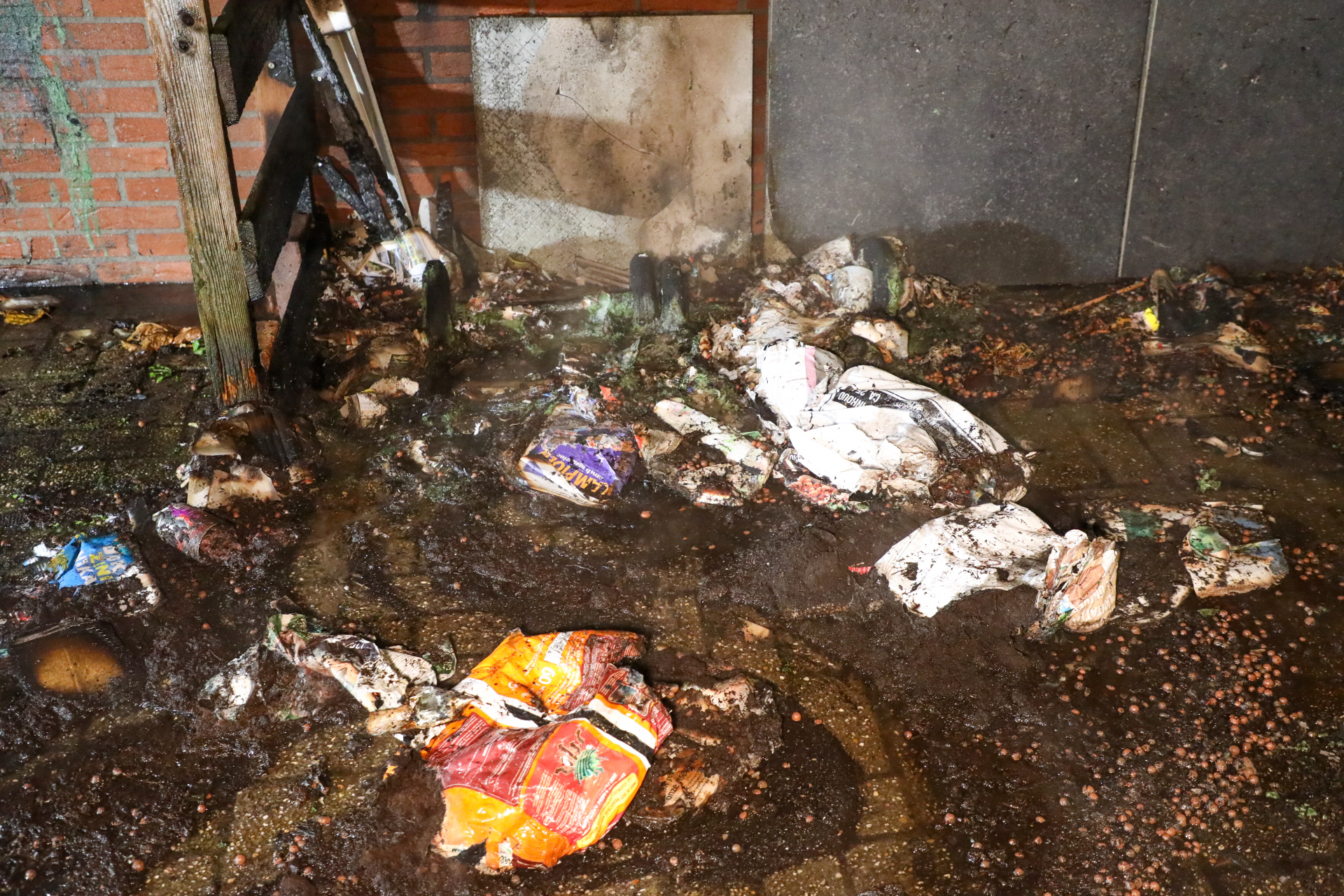 De brand ontstond vermoedelijk door brandstichting in het donkere steegje.