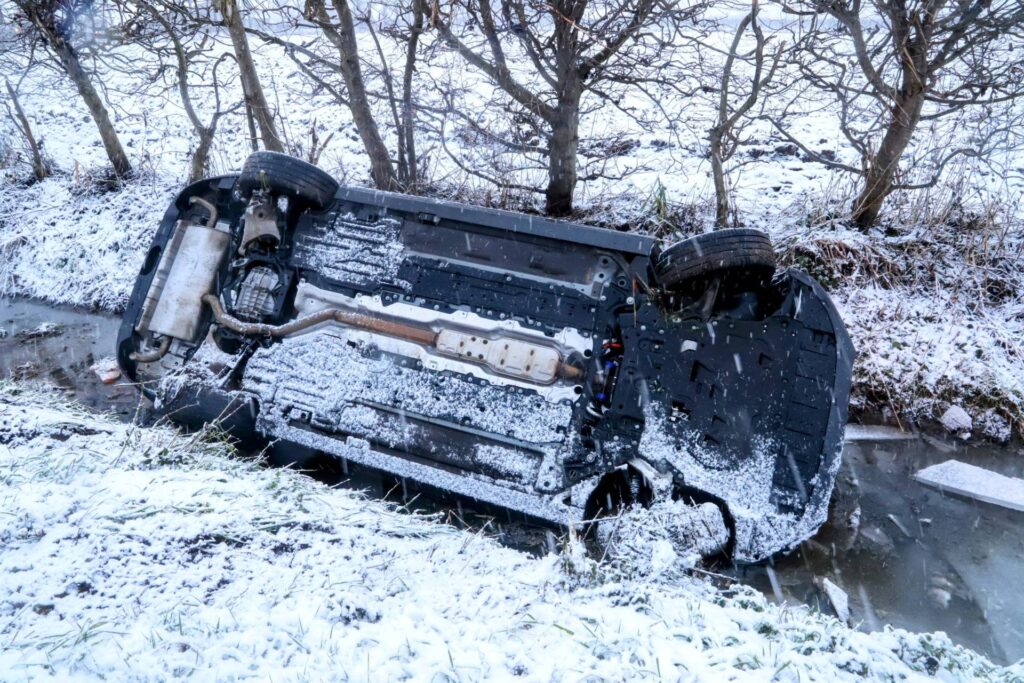 Auto belandt door gladheid op kop in sloot