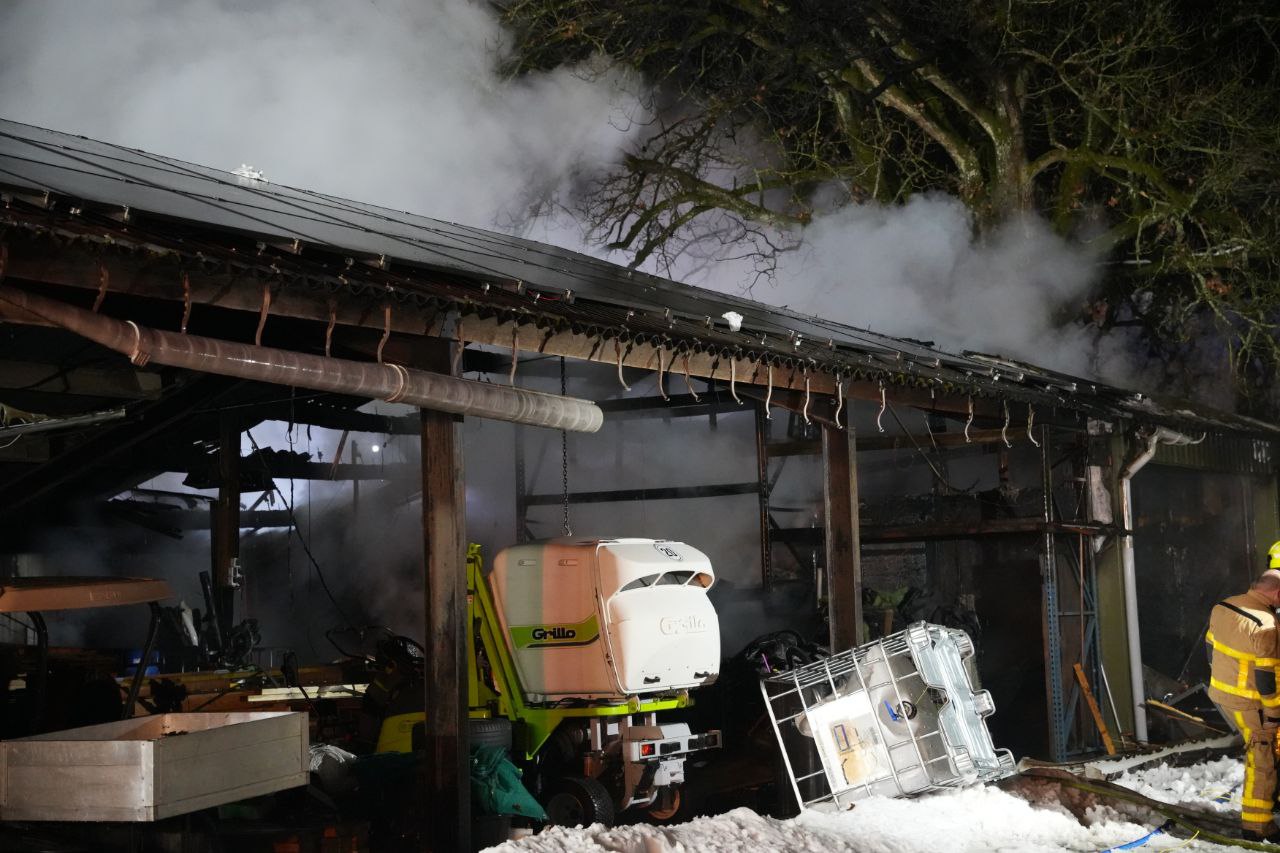 Grote brand in schuur met landbouwvoertuigen, opgeschaald om overslag te voorkomen