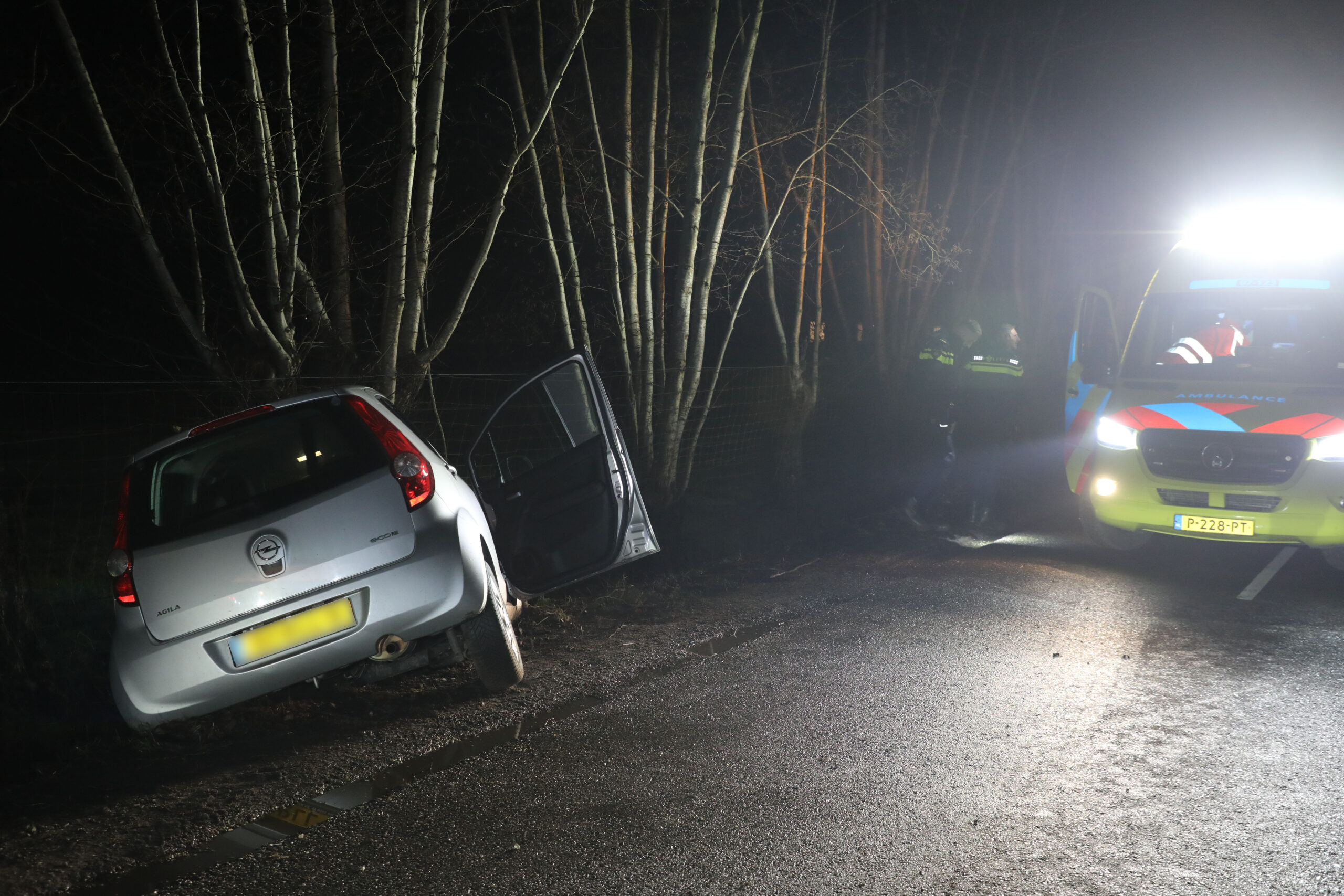 Omdat er een vermoeden bestaat dat de bestuurder onder invloed reed, zijn agenten meegegaan naar het ziekenhuis voor een bloedproef. Een bergingsbedrijf haalt de auto uit de sloot.