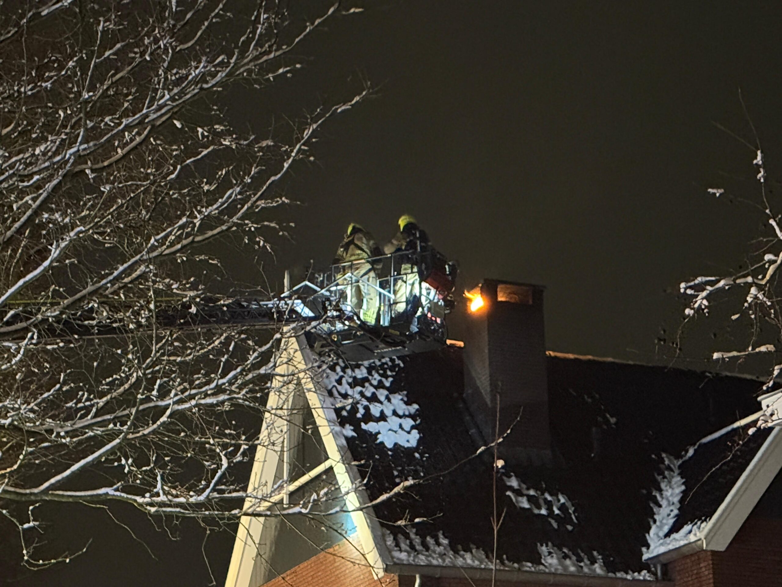 Met behulp van een hoogwerker verwijderde de brandweer de kap en het gaas rondom de schoorsteen om vervolgens het rookkanaal te vegen. Het laatste brandende materiaal uit de kachel is buiten in de sneeuw geblust.