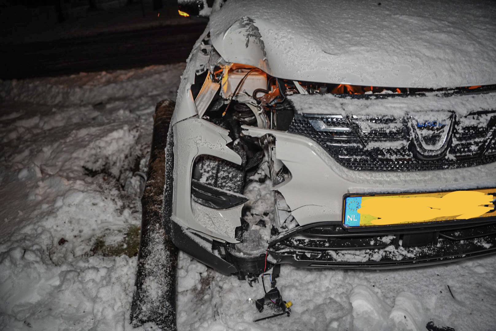 Auto vliegt door gladheid uit bocht en botst tegen lantaarnpaal