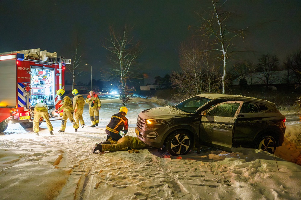 Opvallend was dat een persfotograaf, die het incident wilde vastleggen, zelf met een wiel in een greppel belandde. De brandweer trok zijn auto met een lier weer op de weg.