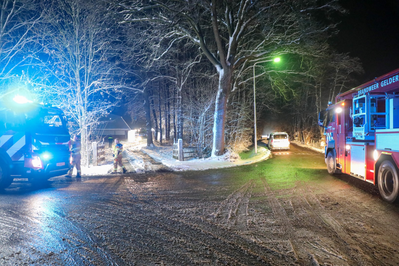 Een shovel die onder de kapschuur stond, vatte vlam, waarna het vuur oversloeg naar een grote berg hooi en stro. De brandweer is met een kraanwagen bezig om de berg stro uit elkaar te halen om het vuur volledig te kunnen blussen.