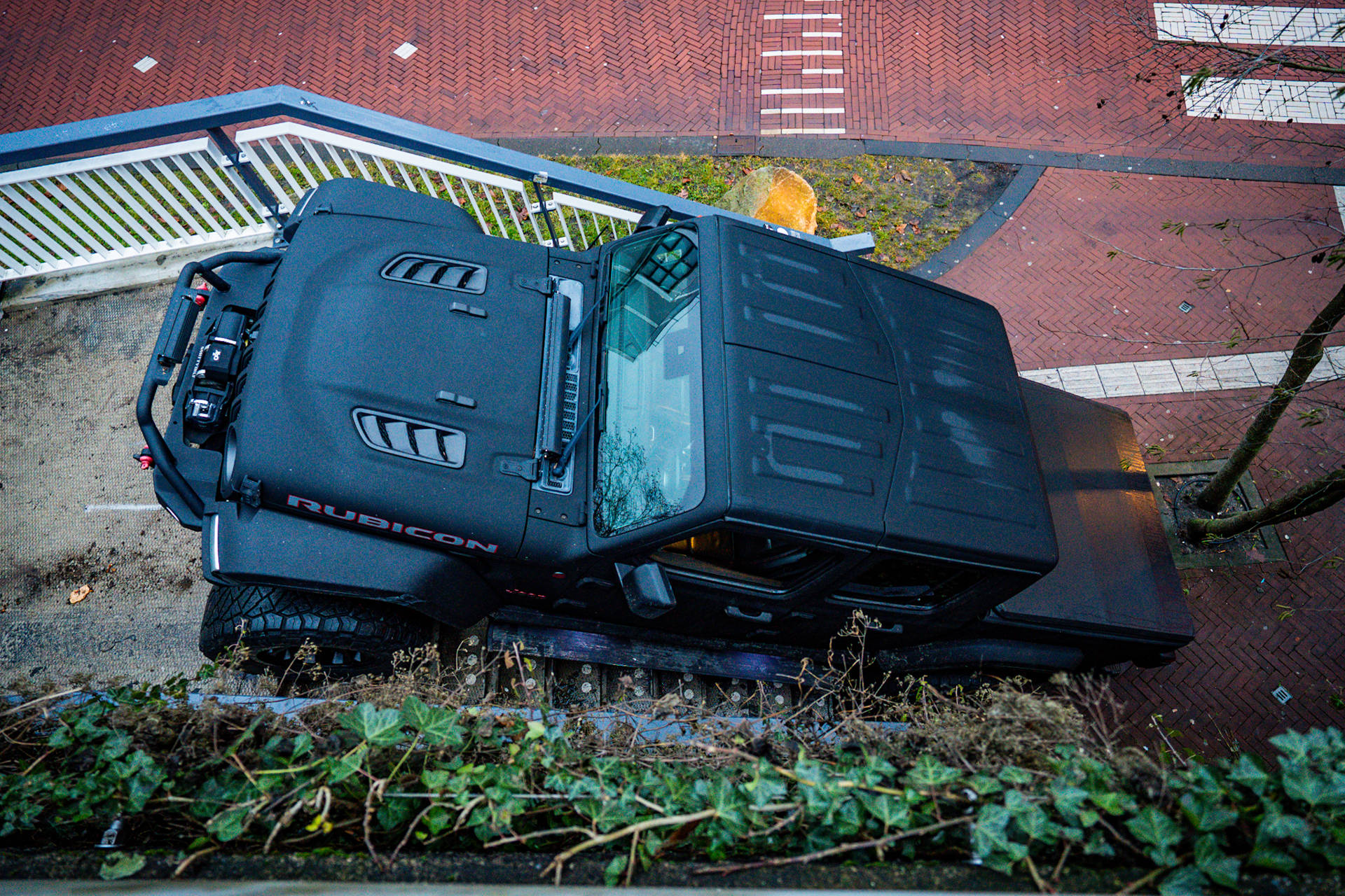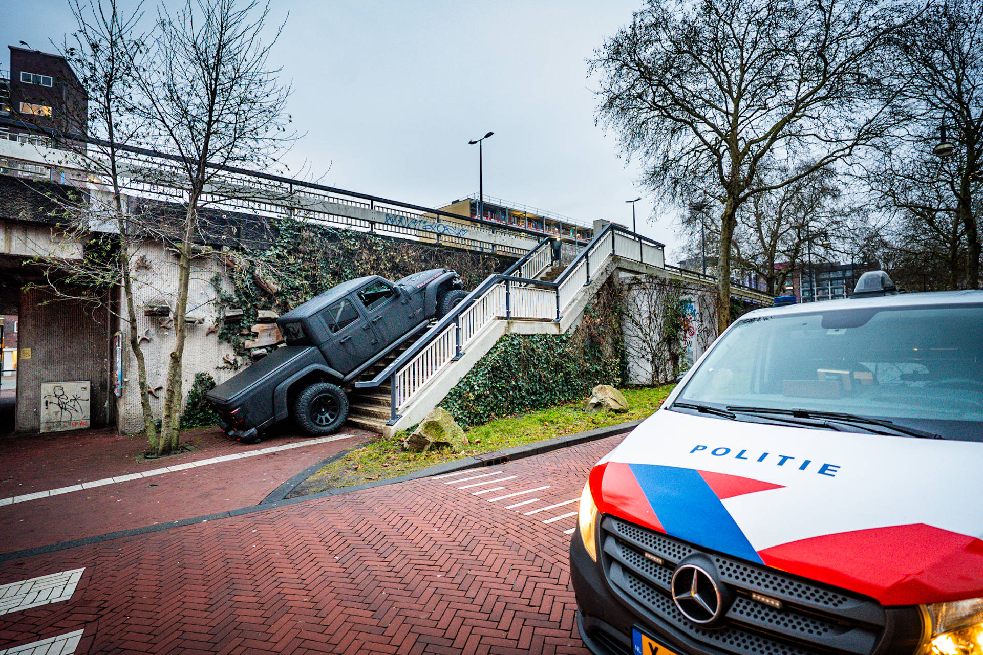 Pick-up komt klem te zitten op trap, bestuurder slaat op de vlucht