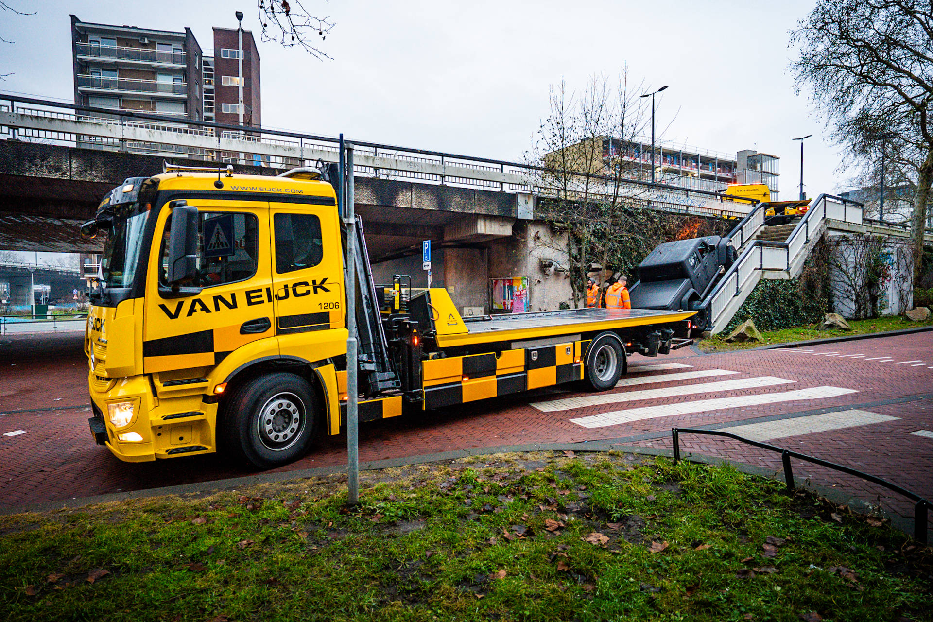 ARNHEM – Bij de Oude Oeverstraat in de binnenstad van Arnhem is zondagochtend vroeg een bestuurder met een pick-up vast komen te zitten op een voetgangersopgang naar de Nelson Mandelabrug.