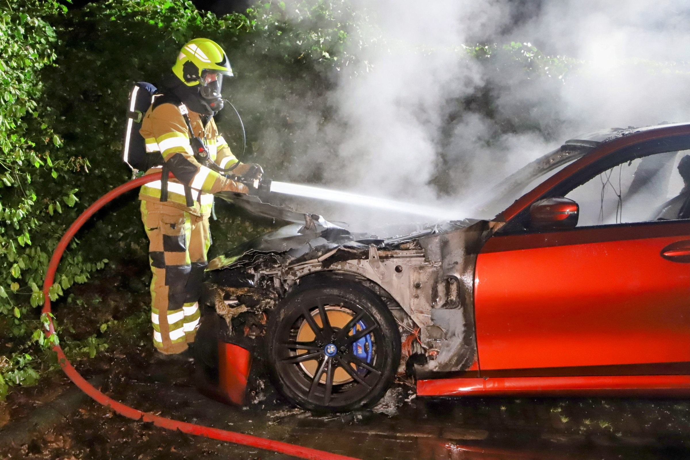De brandweer wist het vuur uiteindelijk te blussen, maar kon niet voorkomen dat de auto volledig uitbrandde. Over de oorzaak van de brand is nog niets bekend.
