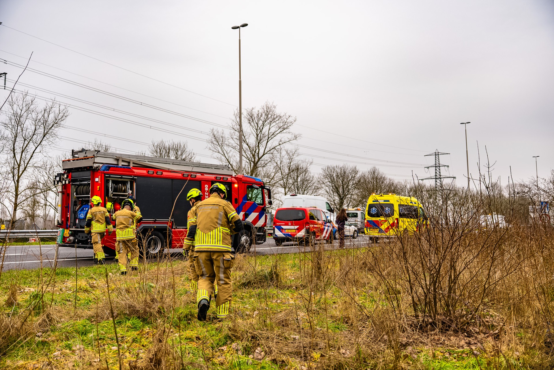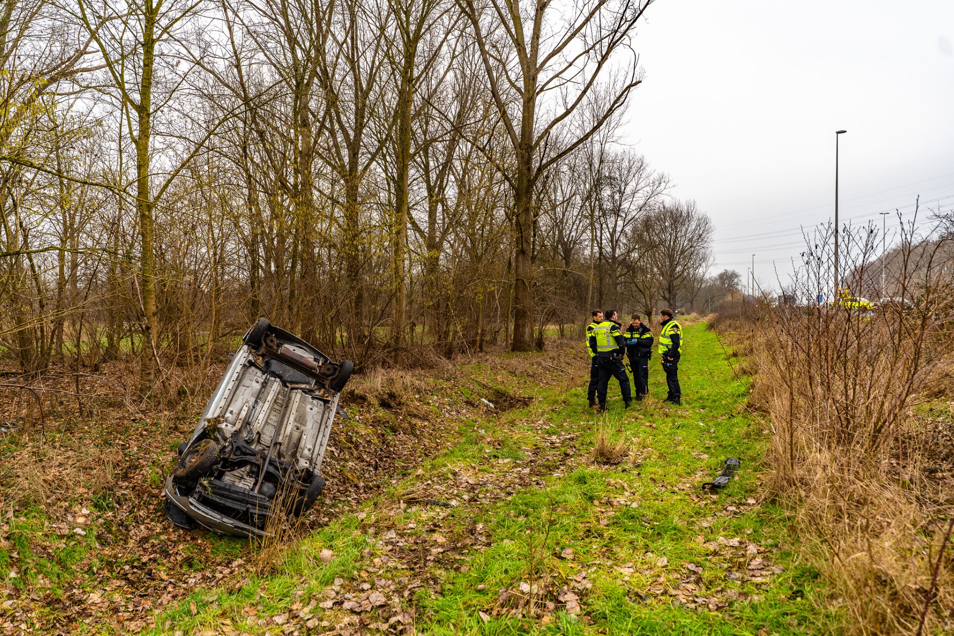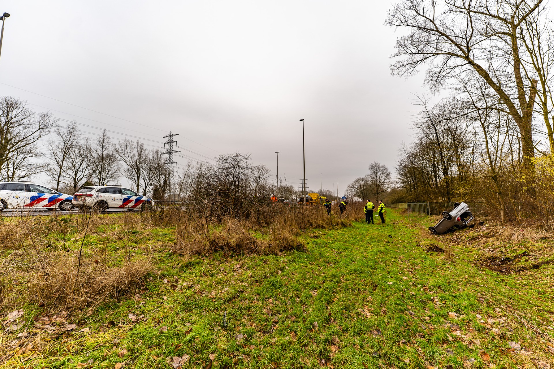 Meerdere politiewagens, een ambulance en de brandweer kwamen met spoed ter plaatse. Een auto raakte van de weg en belandde ondersteboven in de berm.