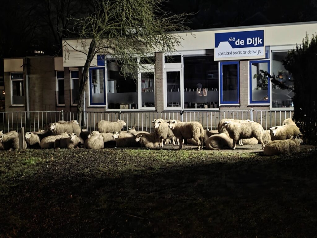 De melding kwam in de vroege ochtend binnen. De schapen werden over de rotonde geleid en tijdelijk ondergebracht op het terrein van basisschool De Dijk, een school voor speciaal onderwijs. Om te voorkomen dat de dieren opnieuw zouden uitbreken, werden de in- en uitgangen van het terrein afgezet met linten.