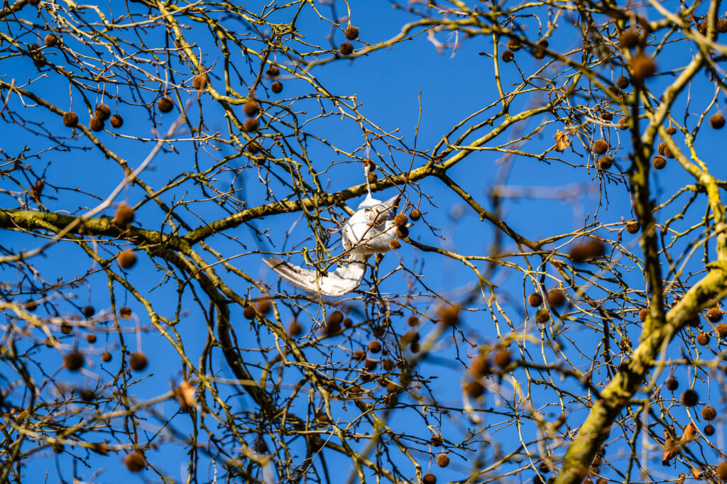 NIJMEGEN – In een boom aan de Tubastraat in Nijmegen is woensdag een meeuw vast komen te zitten met een touw. Het dier hing enkele meters boven de grond en kon zichzelf niet bevrijden.