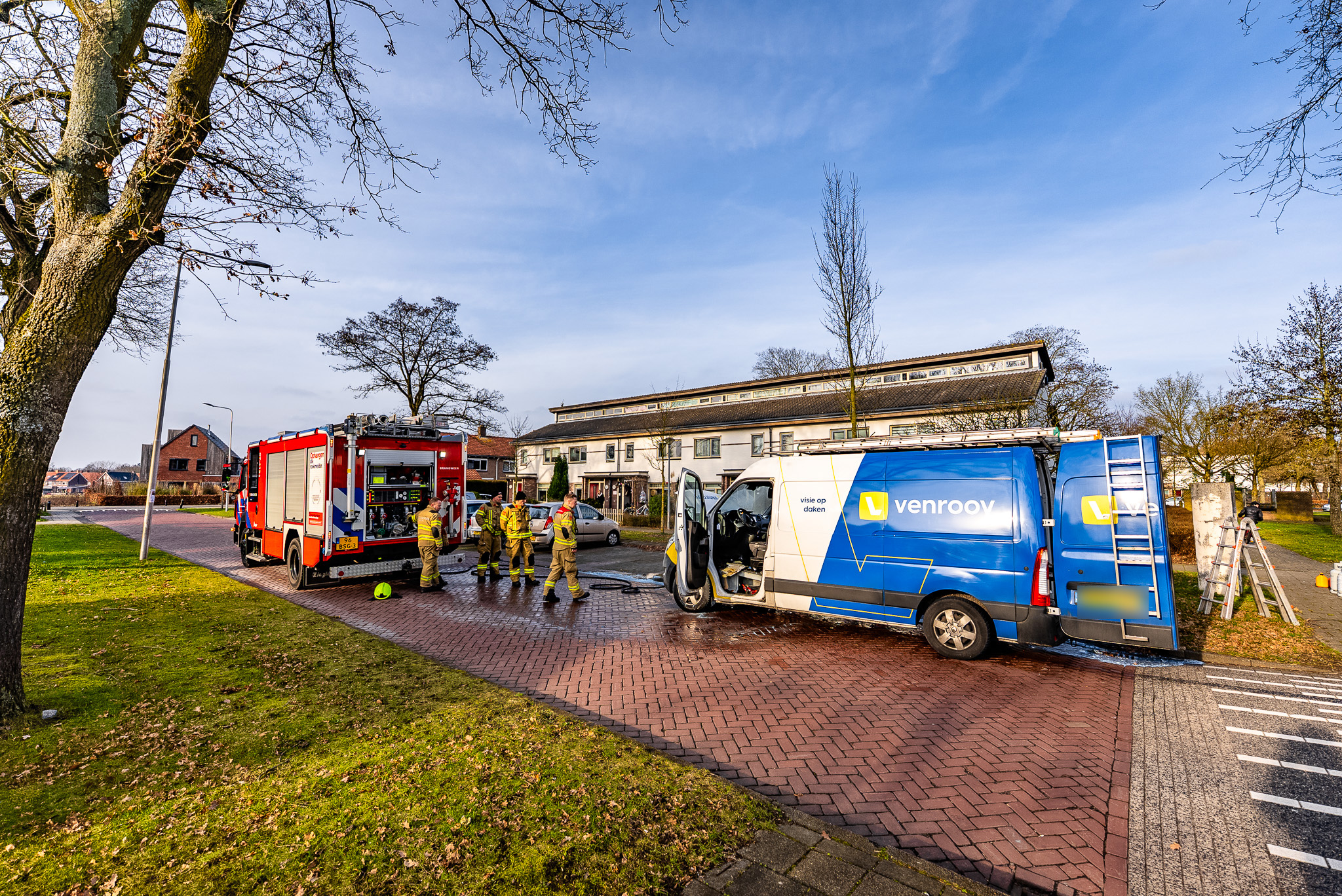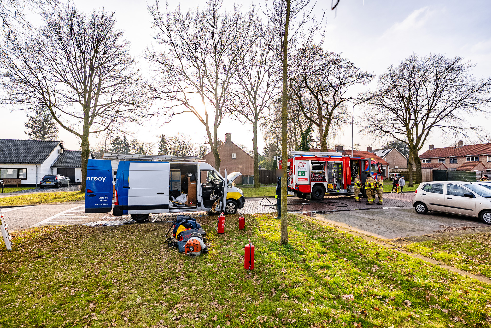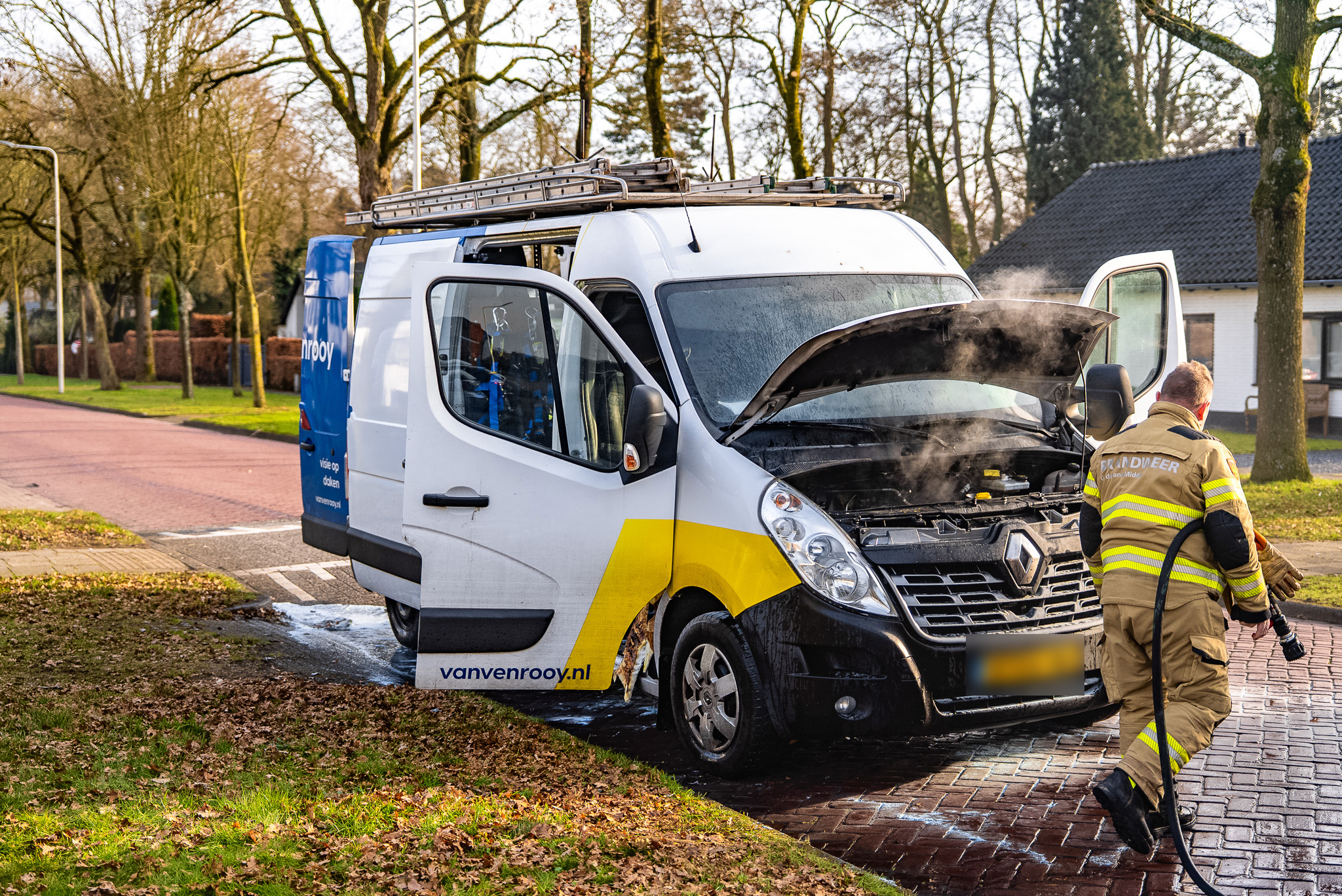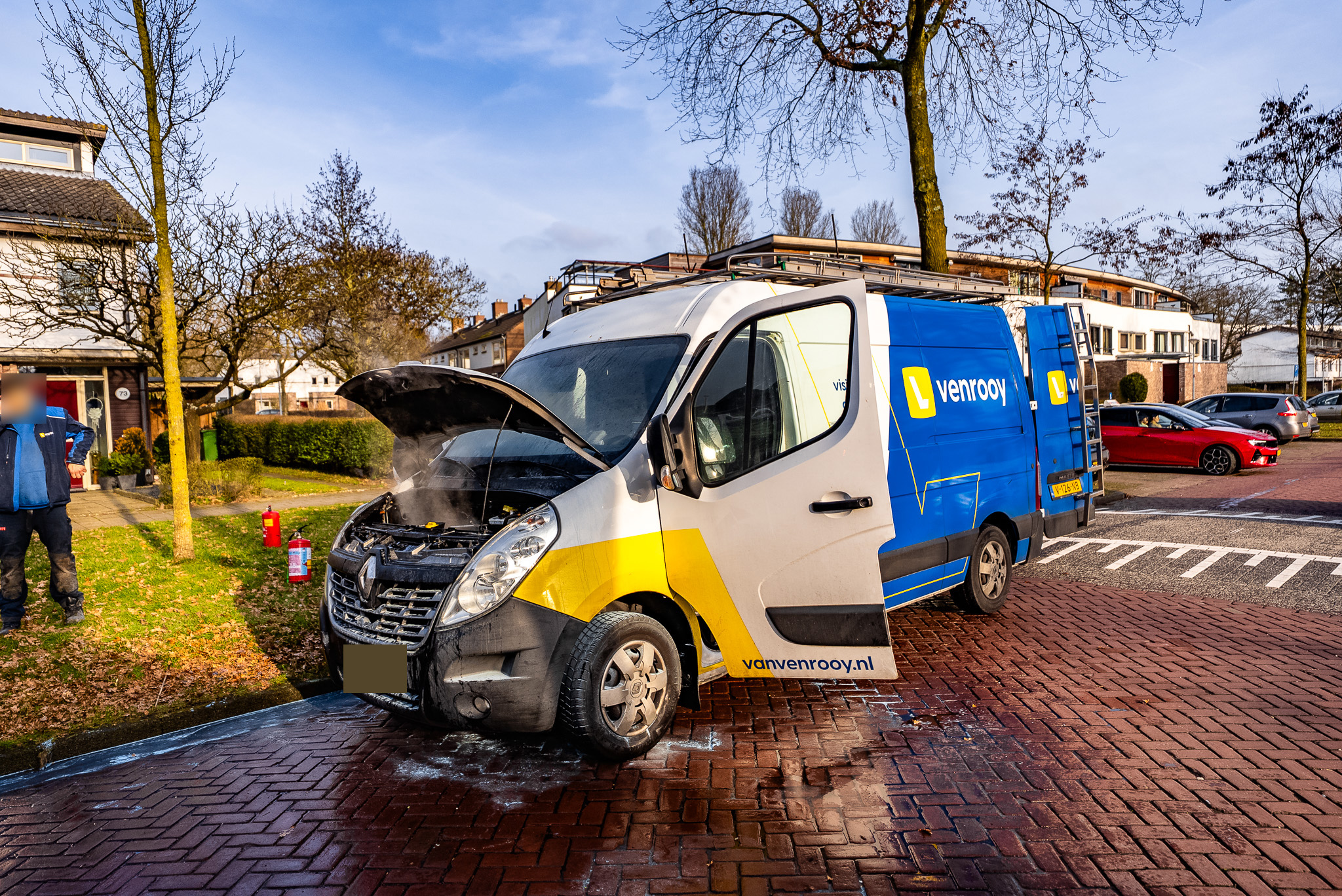 Bestelbus vliegt in brand, inzittenden blussen met brandblussers