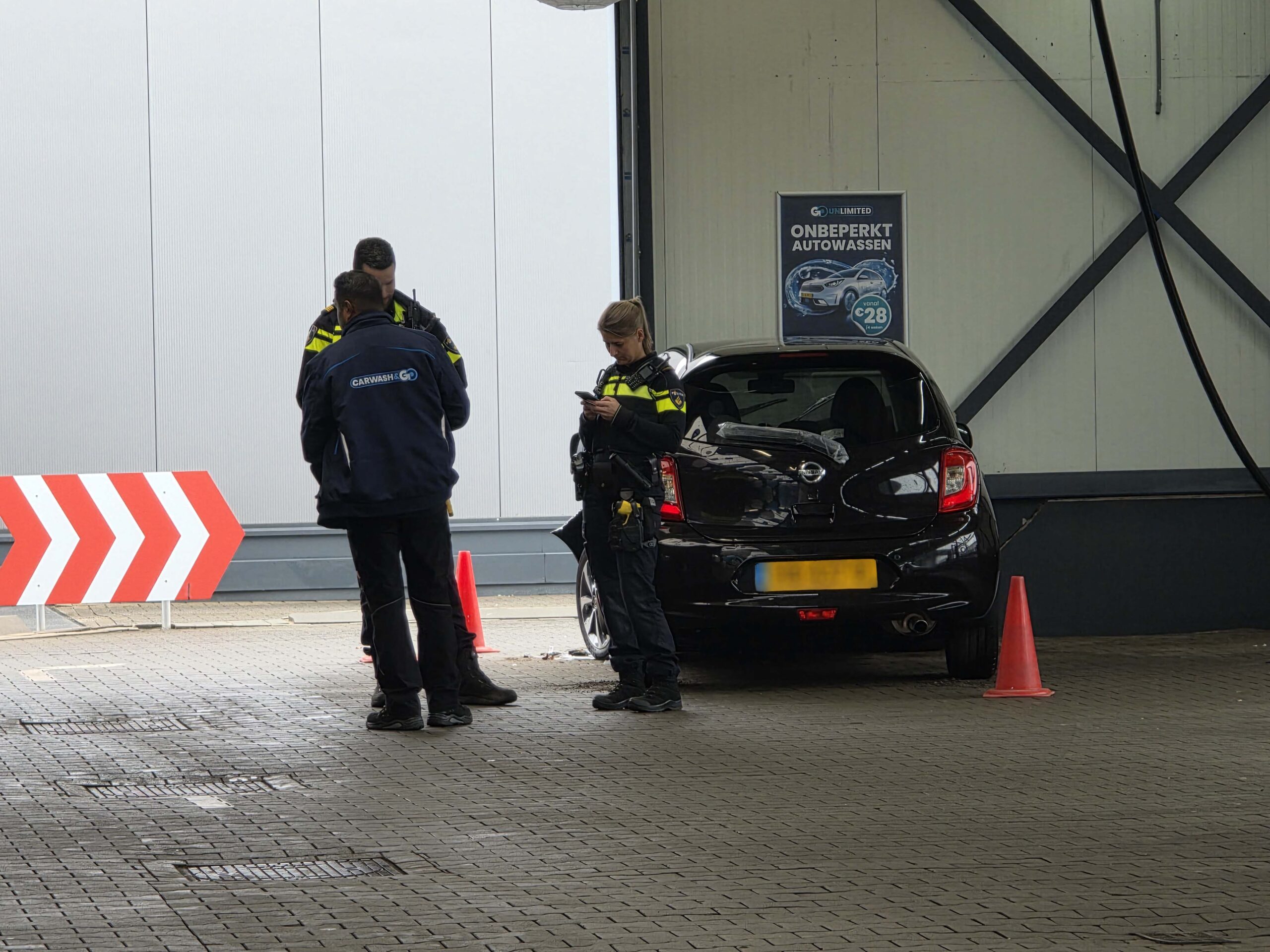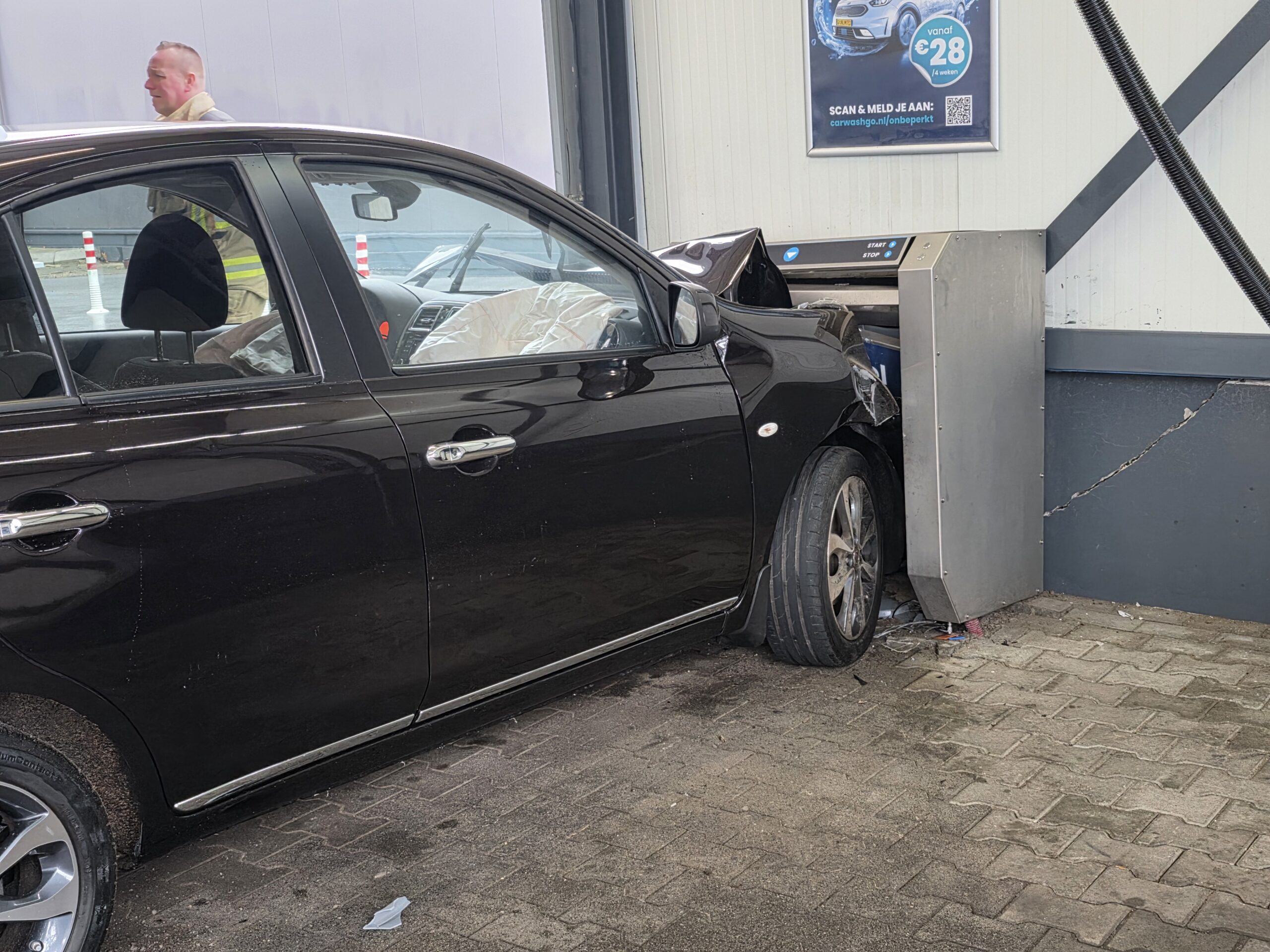 De brandweer controleerde de gevel op mogelijke constructieschade. Door het ongeval is de wasstraat tijdelijk gesloten. De auto liep flinke schade op en wordt afgesleept.