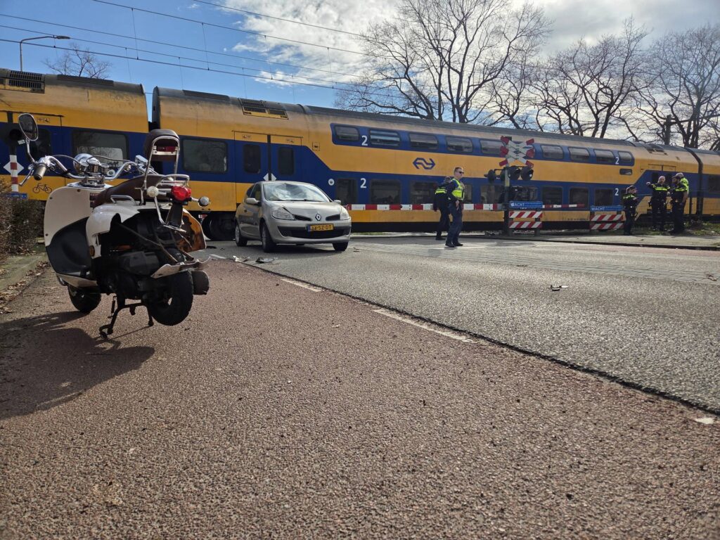 Auto op spoor geraakt door trein na botsing met scooter