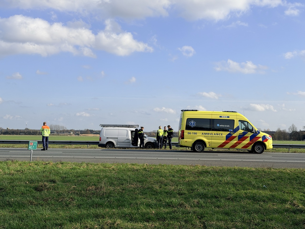 Hulpdiensten, waaronder de brandweer uit Harderwijk, politie en ambulance, werden naar de snelweg gestuurd. Ter plaatse bleek sprake van een eenzijdig ongeval. Op de tweede rijstrook stond een personenauto tegen de vangrail.