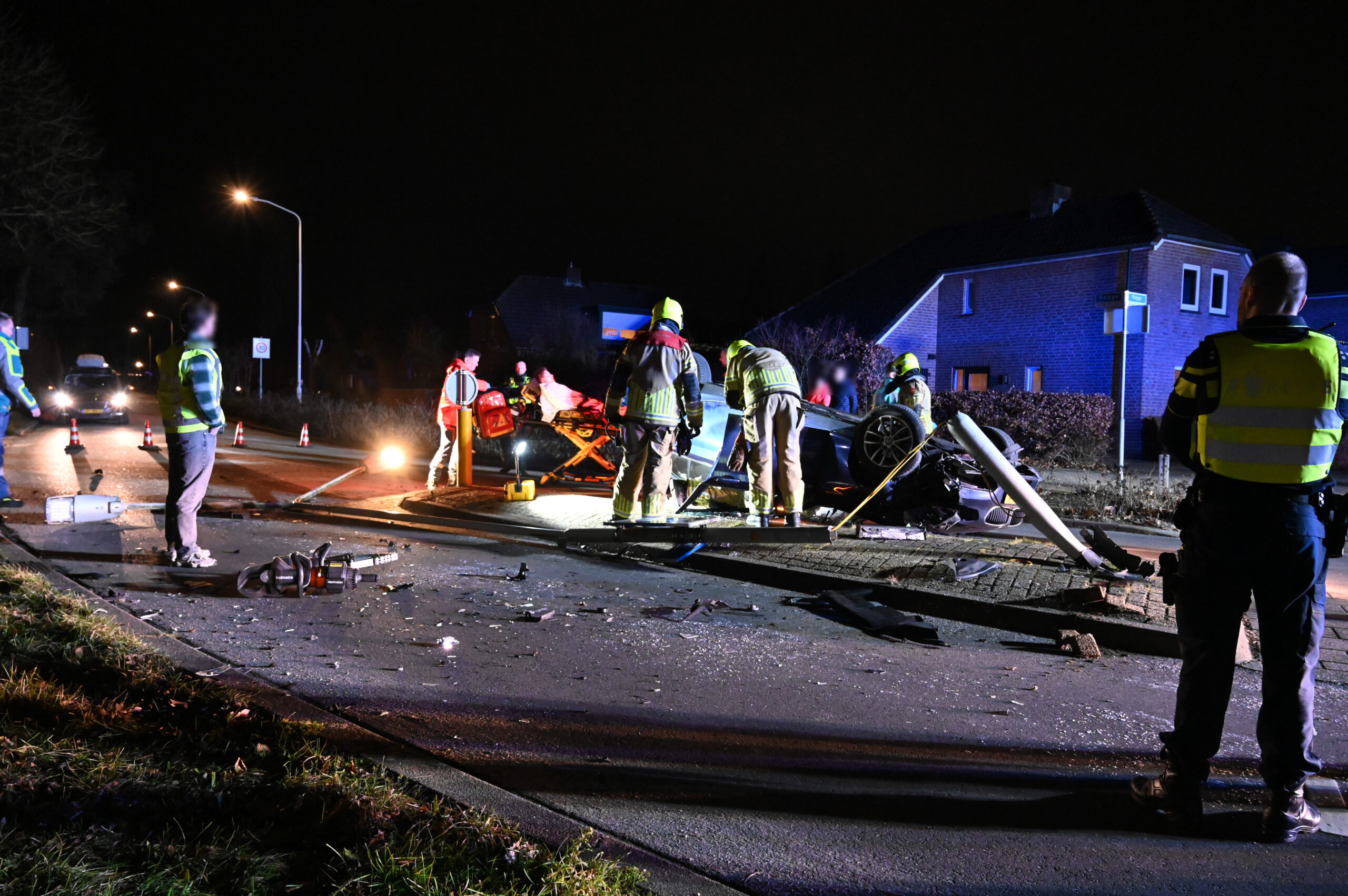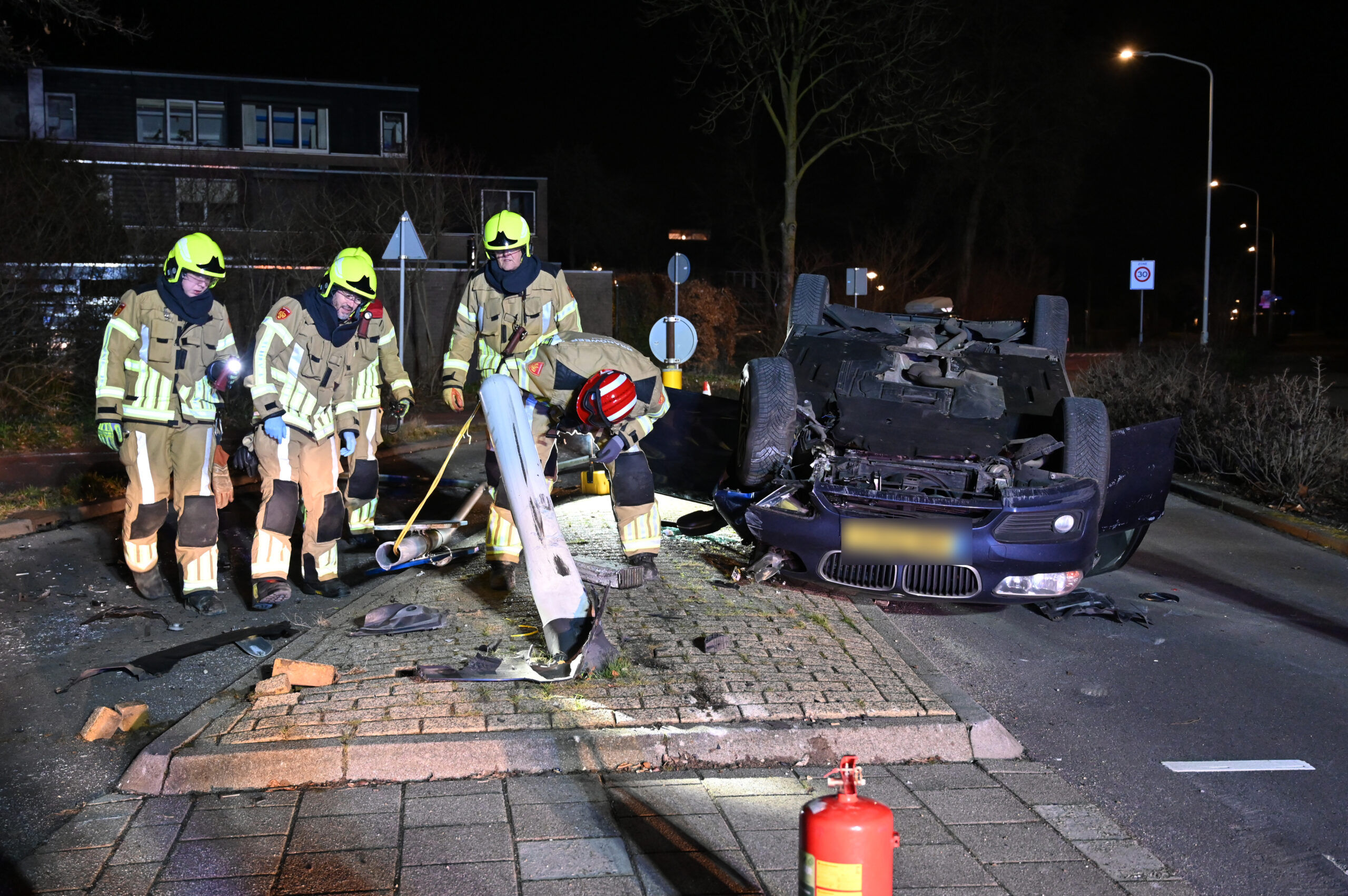 BMW slaat over de kop na botsing tegen lantaarnpaal
