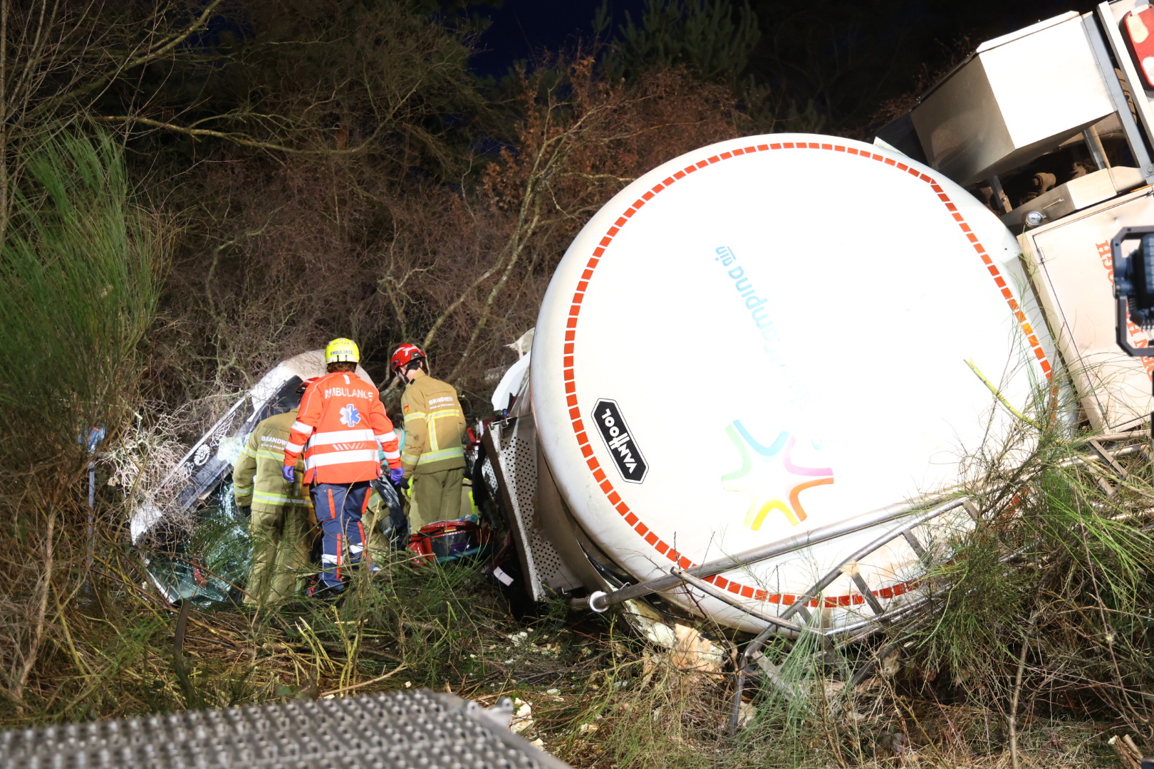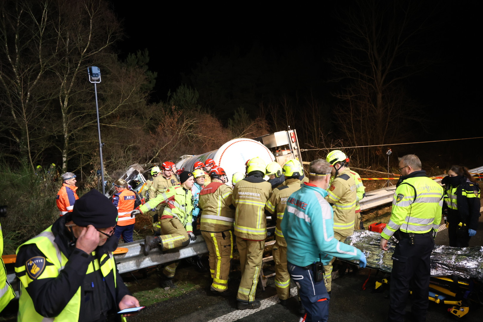 De eerste melding kwam rond 17.38 uur binnen. Volgens beelden van Rijkswaterstaat reed de tankwagen eerst door de berm en schoot vervolgens door de vangrail, waarna het voertuig kantelde en in de berm tot stilstand kwam. Meerdere hulpdiensten, waaronder een traumahelikopter, rukten massaal uit. De chauffeur raakte bekneld en zat geruime tijd in een benarde positie. Bijna twee uur na het ongeval is het slachtoffer door de hulpdiensten bevrijd. Na de reddingsactie is de chauffeur met spoed overgebracht naar het ziekenhuis.